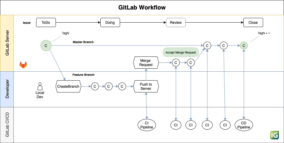GitLab의 개발 라이프사이클은 이슈 아이템으로 요건이나 수정해야 할 버그를 등록하는 것으로 시작됩니다. 개발자는 자신에게 할당된 이슈 아이템을 확인하고 신규 Feature 브랜치를 생성합니다. 신규 브랜치에서 이슈 아이템을 처리하기 위한 커밋 활동을 반복적으로 하며, 어느 정도 완성이 되면 GitLab 서버로 브랜치를 Push 합니다.