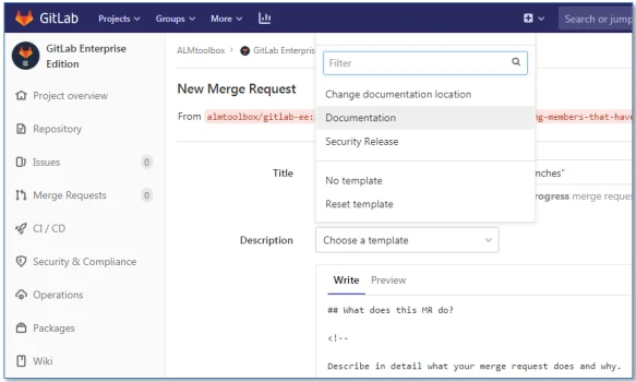 MR의 내용을 일관되게, 팀의 합의된 룰에 맞게 의사소통하기 위해 템플릿을 만들어서 쓸 수 있습니다. 레파지토리 내에 .gitlab/merge_requests_template/템플릿명.md 파일을 생성하면 아래와 같이 템플릿을 선택할 수 있습니다. (이슈 템플릿을 만드는 것과 유사합니다. 이슈 템플릿은 .gitlab/issue_template/템플릿명.md 을 사용합니다.)