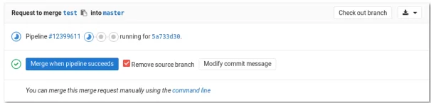 MR을 처리할 준비가 되었지만, 아직 하나 이상의 CI Job이 실행 중이라면 Merge when pipeline success 버튼을 통해 CI의 Job이 완료될 때까지 기다릴 필요없이 완료 후 자동으로 Merge를 수행하게 됩니다.