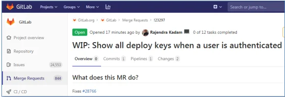 위에 화면에 보이는 것처럼 Merge Request는 코멘트를 이용한 논의, commit 목록, 파이프라인 및 관련 이슈 확인, 코드 변경에 대한 인라인 리뷰를 할 수 있는 탭이 포함되어 있습니다.