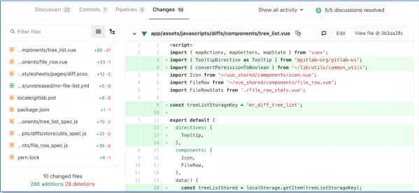 Changes 탭에서는 MR 요청에 변경된 전체 파일 목록을 트리로 확인할 수 있으며, 해당 파일을 선택하여 필터링하여 Diff를 내비게이션 할 수 있습니다.