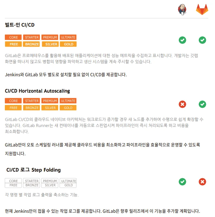 투명성은 당사의 핵심 가치 중 하나이기에 당사 웹사이트에는 GitLab 와 다른 DevOps툴을 비교한 내용을 공개하고 있습니다. Jenkins 는 CI/CD를 제공하지만 다른 빌트인 기능은 미흡합니다. 또한 플러그인에 대한 높은 의존도는 Jenkins가 시간이 지남에 따라 유지보유 비용도 더 커질 수 있다는 것을 의미합니다.