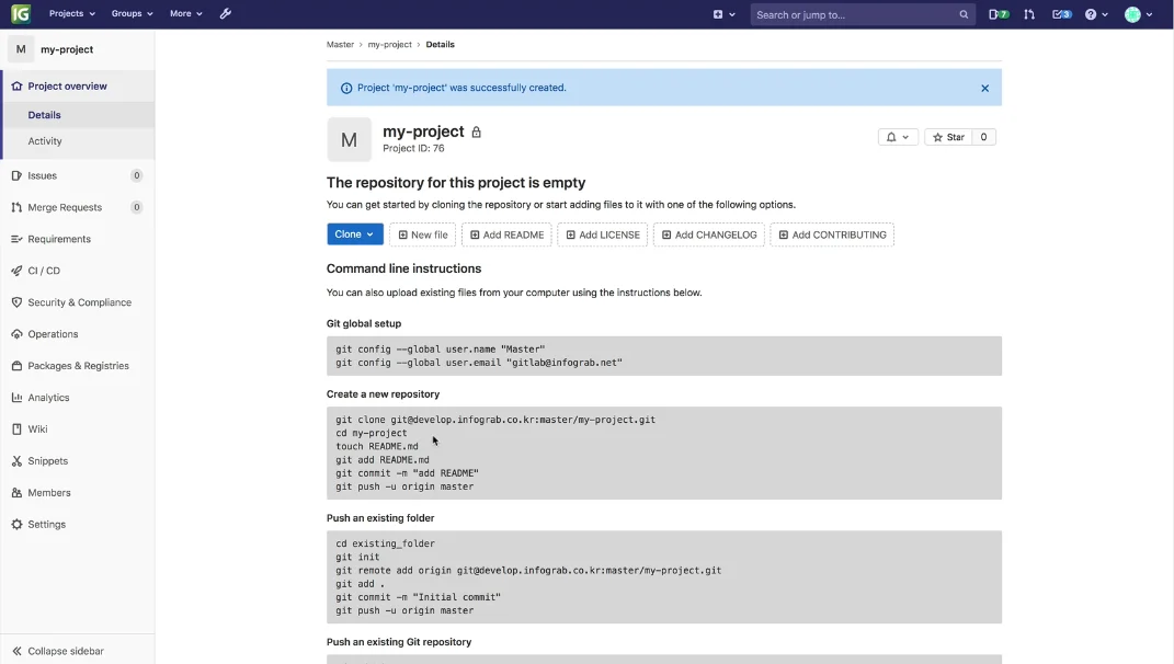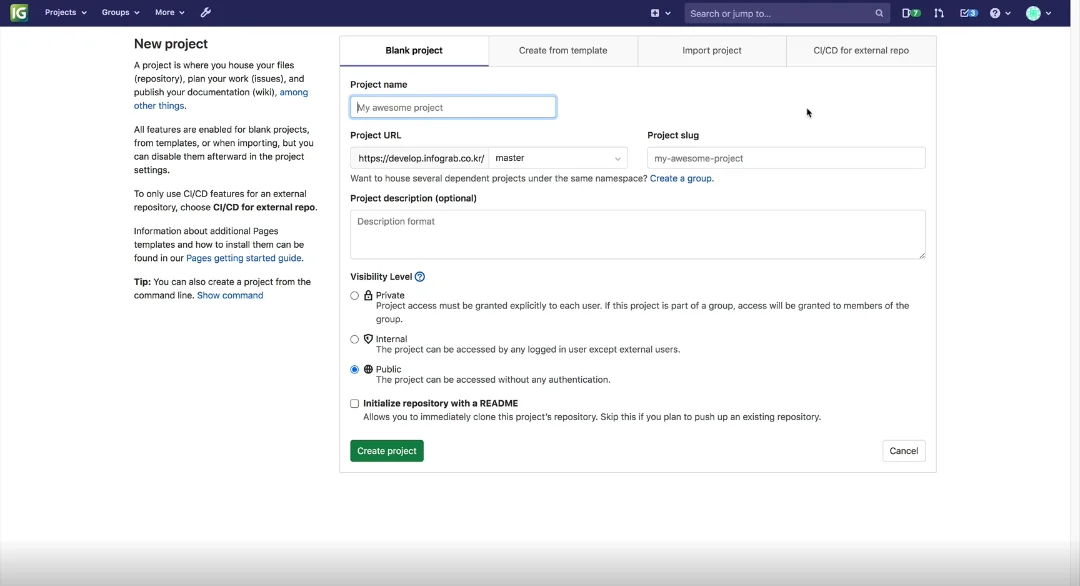 그룹 혹은 팀 프로젝트에 참여하지 않고 개인 프로젝트를 진행할 경우가 있습니다. GitLab은 개발자 친화적인 UI를 갖고 있기 때문에 대부분의 작업을 Web UI에서 할 수 있습니다. 개인 프로젝트를 GitLab의 Web UI를 이용하여 시작하는 방법을 알아 보겠습니다.