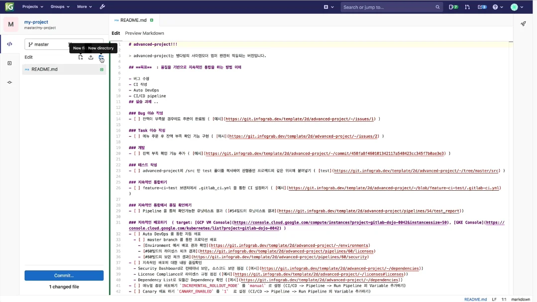 상단에 보이는 많은 버튼 중에 Add README 버튼을 클릭하면 readme 파일을 생성할 수 있는 화면으로 넘어가게 됩니다. GitLab 버전에 따라서 웹 에디터 혹은 web IDE로 넘어가게 됩니다. web IDE로 넘어가는 경우에는 커밋을 완료하여야 초기 git 레파지토리를 세팅할 수 있게 됩니다.