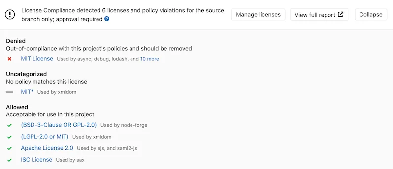 | License Compliance | 오픈 소스 라이센스에 대한 사용 여부를 소스에서 탐지해서 제공 | - License Finder | Ultimate | - Docker 이미지를 사용 - Auto DevOps에 포함 - Merge Request에서 리포트 형식으로 제공 - 주로 사용되는 6개 정도의 언어 지원 |
