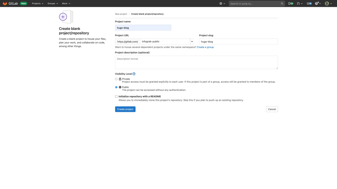 GitLab Pages 를 사용하기 위해 먼저 'hugo-blog'라는 이름의 GitLab 프로젝트를 생성하겠습니다.