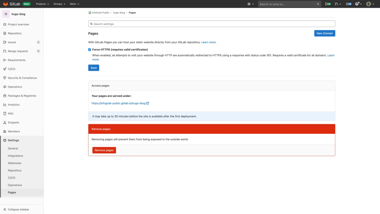 여기서는 GitLab에서 제공하는 gitlab.io가 포함된 주소를 사용하지만 사용자가 호스팅 받은 주소로 연결 시킬 수도 있습니다.