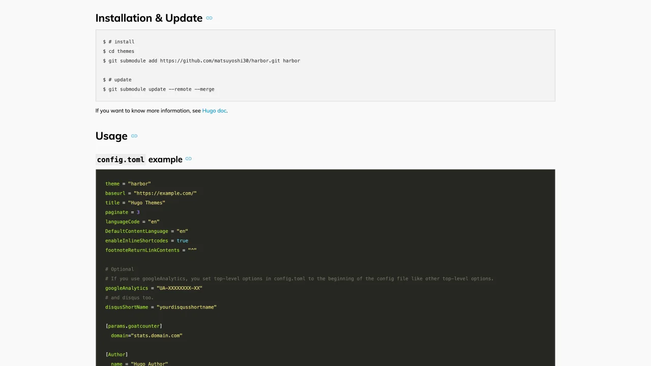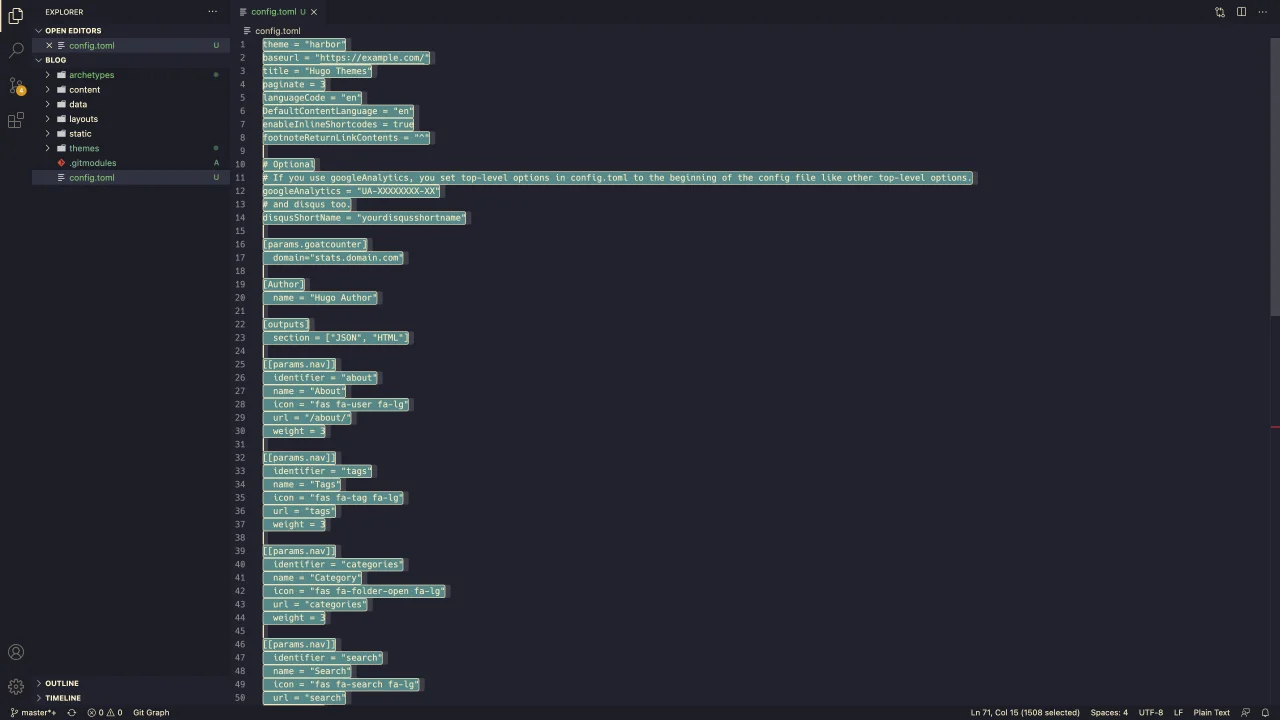 harbor 테마 사용법 설명에서 'config.toml example' 에 있는 내용을 다음과 같이 그대로 붙여 넣겠습니다.