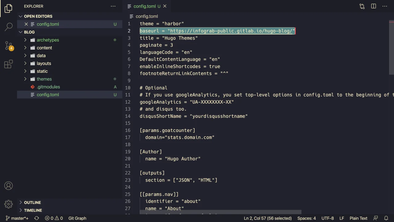 그리고 baseurl 값을 자신의 GitLab Pages의 주소로 변경합니다.