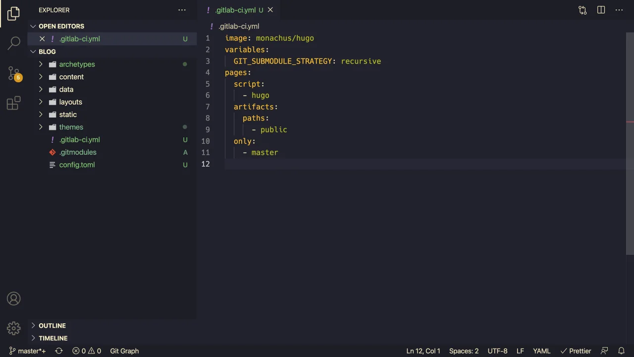 GitLab Pages로 블로그를 배포하기 위해서는 다음과 같이 루트 디렉토리에 .gitlab-ci.yml파일을 생성하고 내용을 입력합니다.