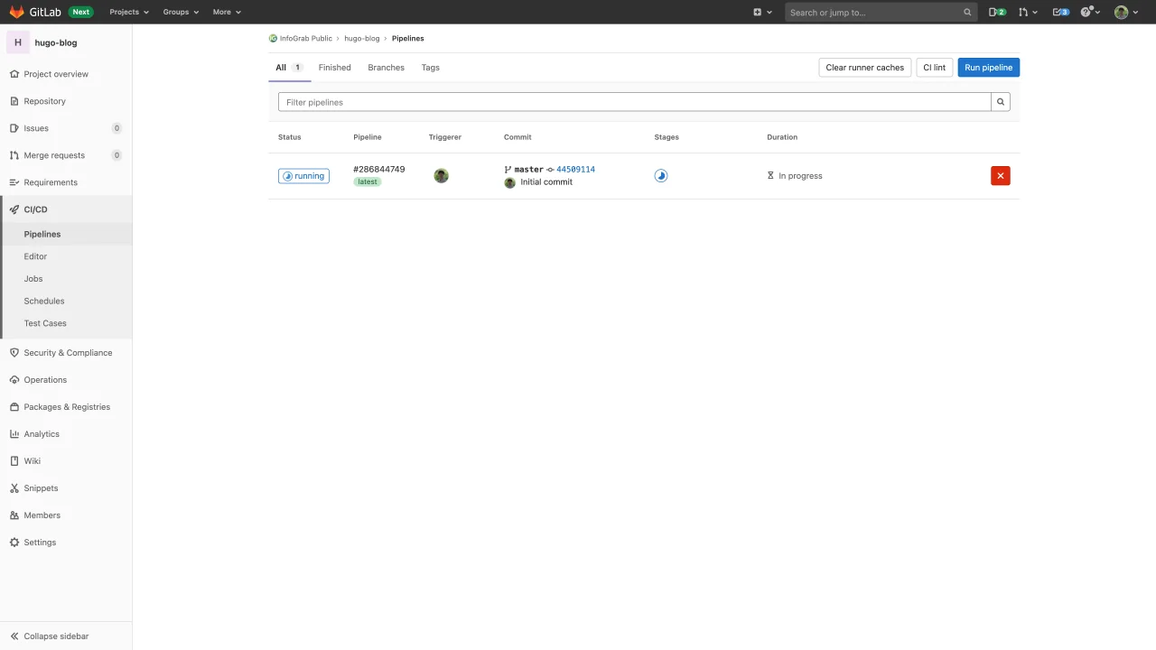 GitLab 프로젝트에서 CI/CD > Pipelines 메뉴에 들어가면 작성한 CI가 돌아가는 것을 확인할 수 있습니다.
