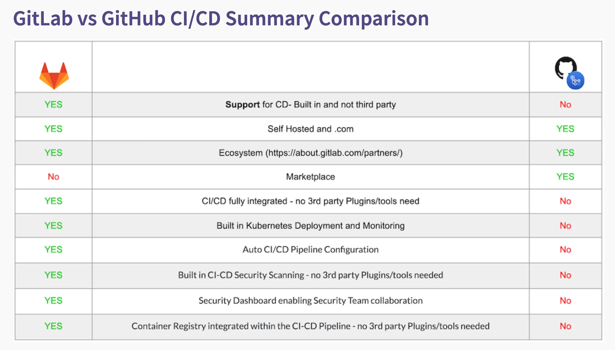 다음은 CI/CD 기능에 대한 비교 요약입니다.