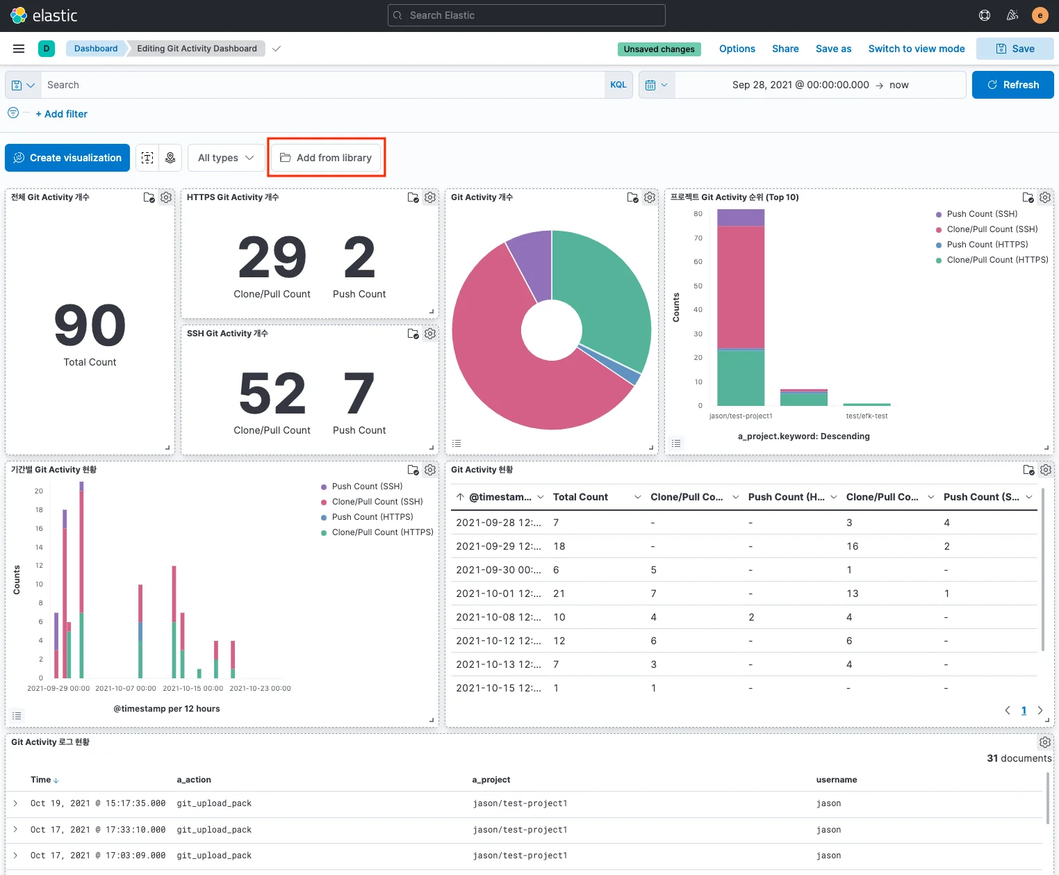Add from library 버튼을 클릭하고, 앞 단계에서 생성한 Visualize Library들을 선택하여 추가한 후, 배치하고 패널 사이즈를 조정합니다.