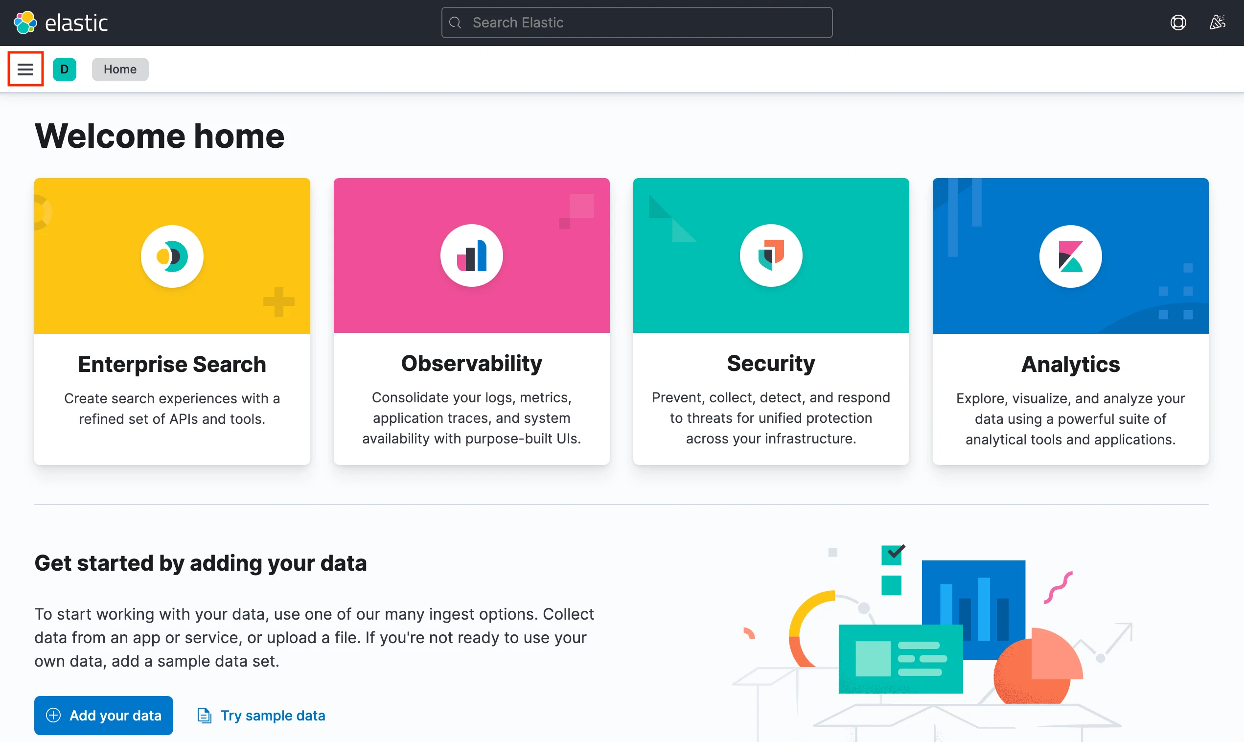 웹 브라우저에서 http://<EFK-IP-or-Domain>:5601로 접속한 후, 좌측 상단의 햄버거 아이콘을 클릭하면 메뉴 패널이 나타납니다.