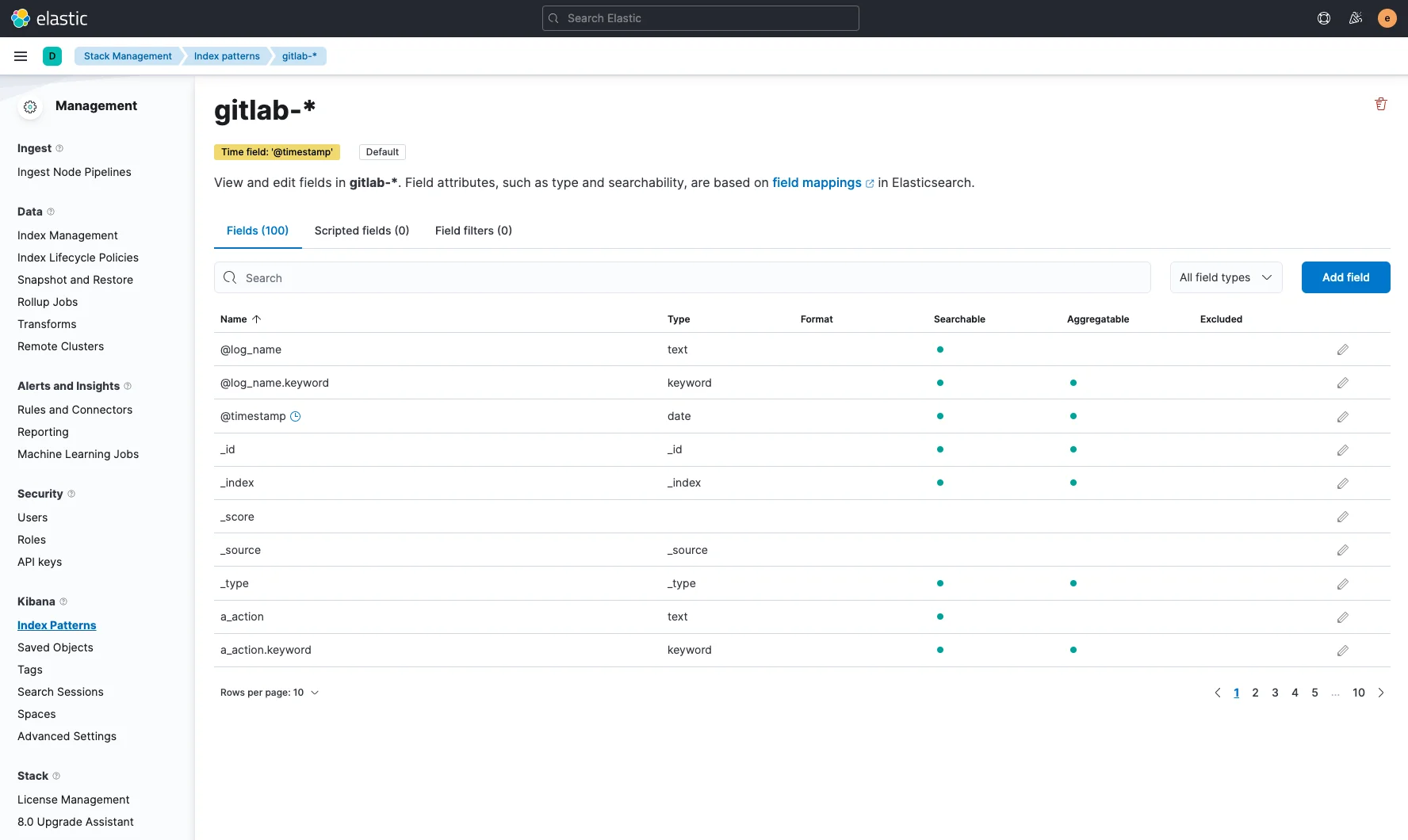 Name에 gitlab-*을 입력하고 Timestamp field에 @timestamp을 선택한 후, Create index pattern 버튼을 클릭하여 Index Pattern을 생성합니다.
