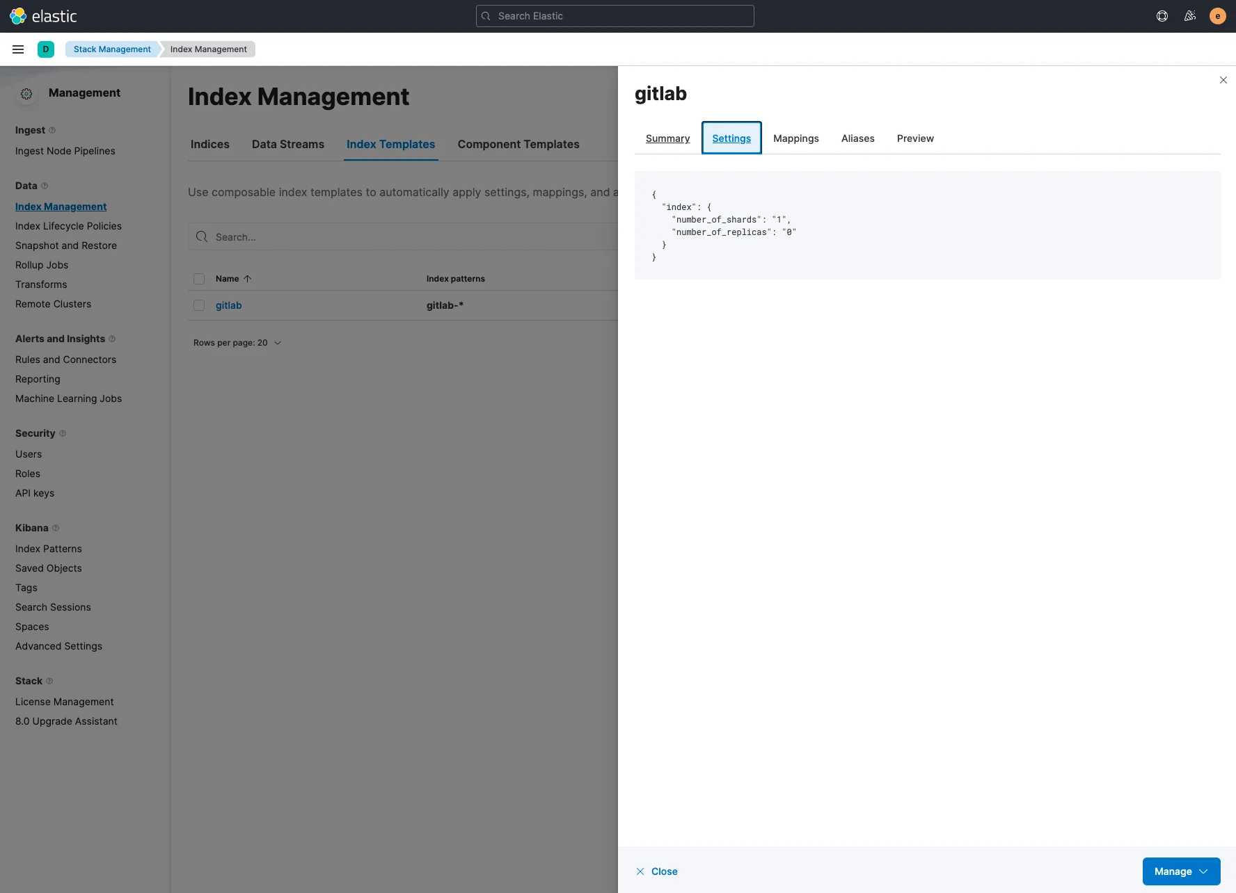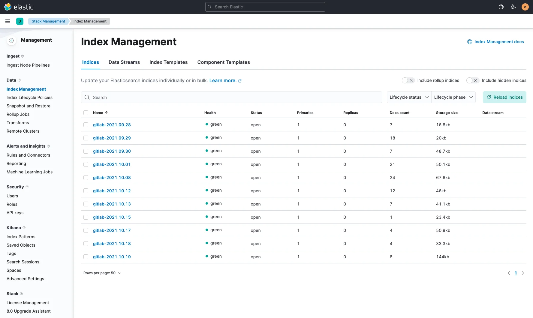 Stack Management > Data > Index Management 메뉴의 Indices 탭에서 gitlab-2021.09.28, gitlab-2021.09.29, gitlab-2021.09.30 등 인덱스 목록을 볼 수 있는데, 인덱스의 Health가 yellow 상태일 것입니다. 이는 Elasticsearch 클러스터가 단일 노드로 구성되어 있어 Shard와 Replica를 분산하여 저장할 다른 노드가 없기 때문입니다.