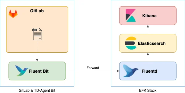 Fluent Bit가 GitLab의 로그를 수집하여 Fluentd로 전송합니다.