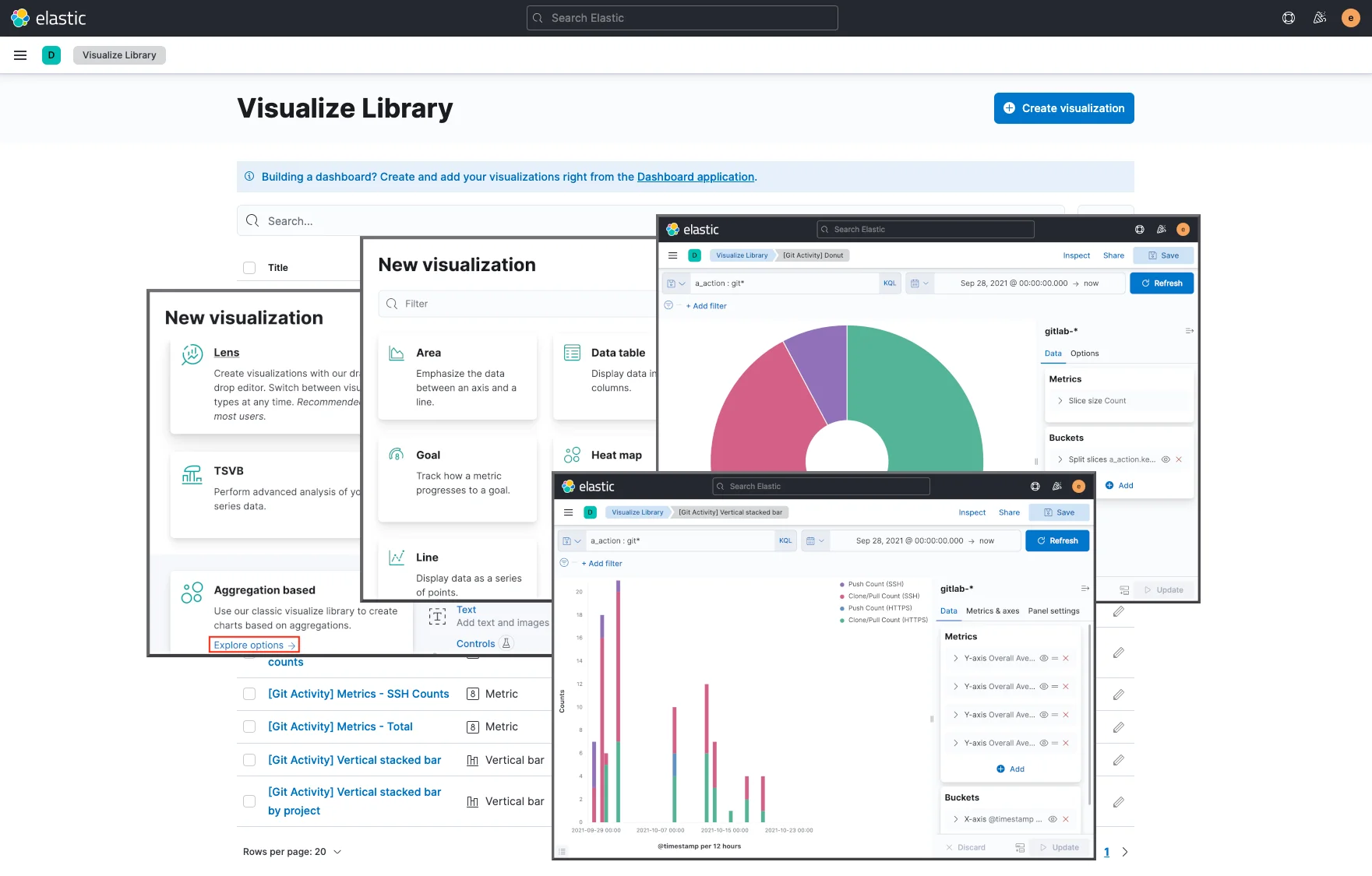 New visualization 모달 창에서 Aggregation based의 Explore options 링크 클릭한 후, Data table, Metric, Pie, Vertical bar 등 Kibana에서 제공되는 다양한 Visualization 기능을 이용하여 로그 데이터를 시각화합니다.