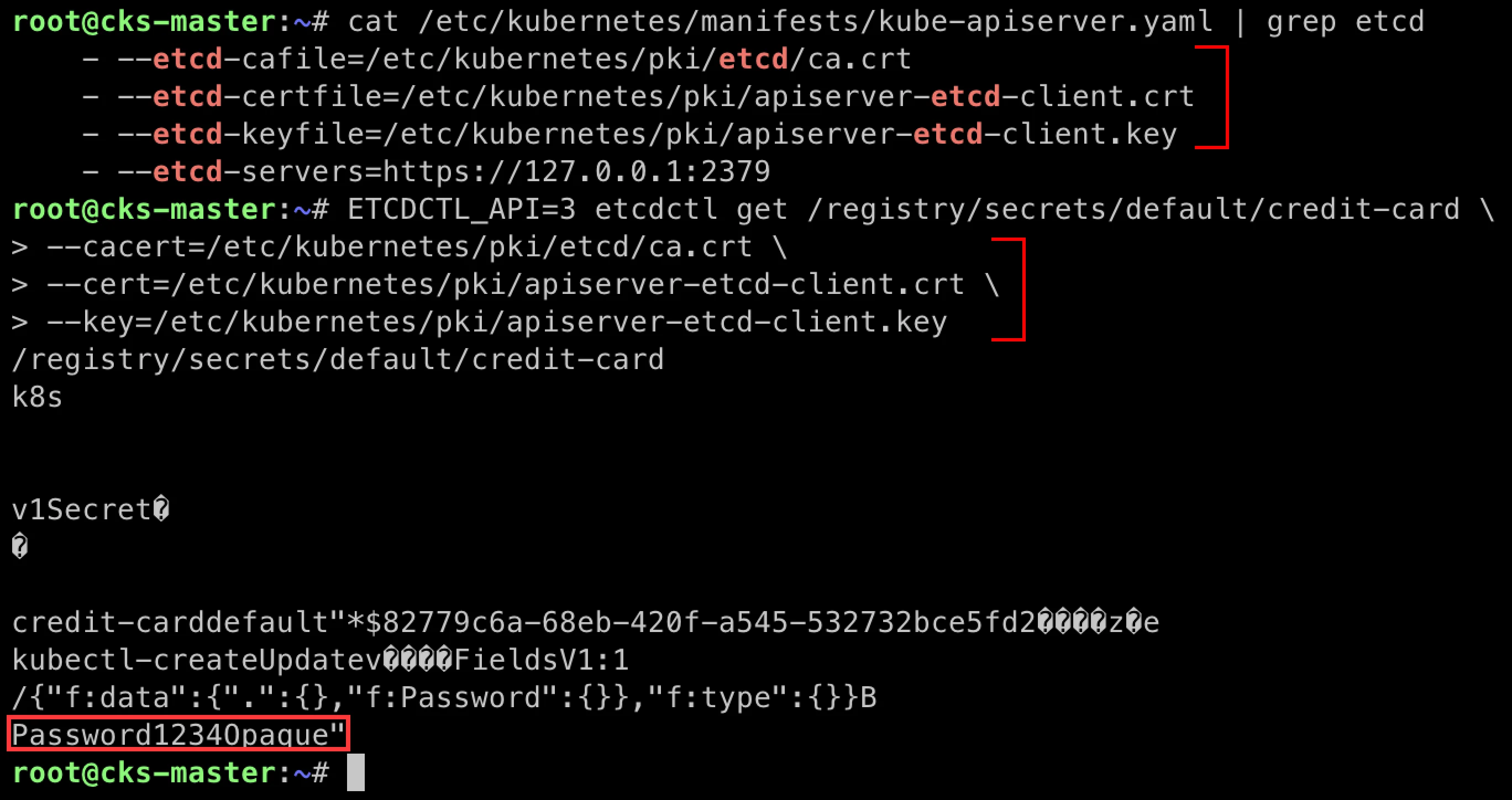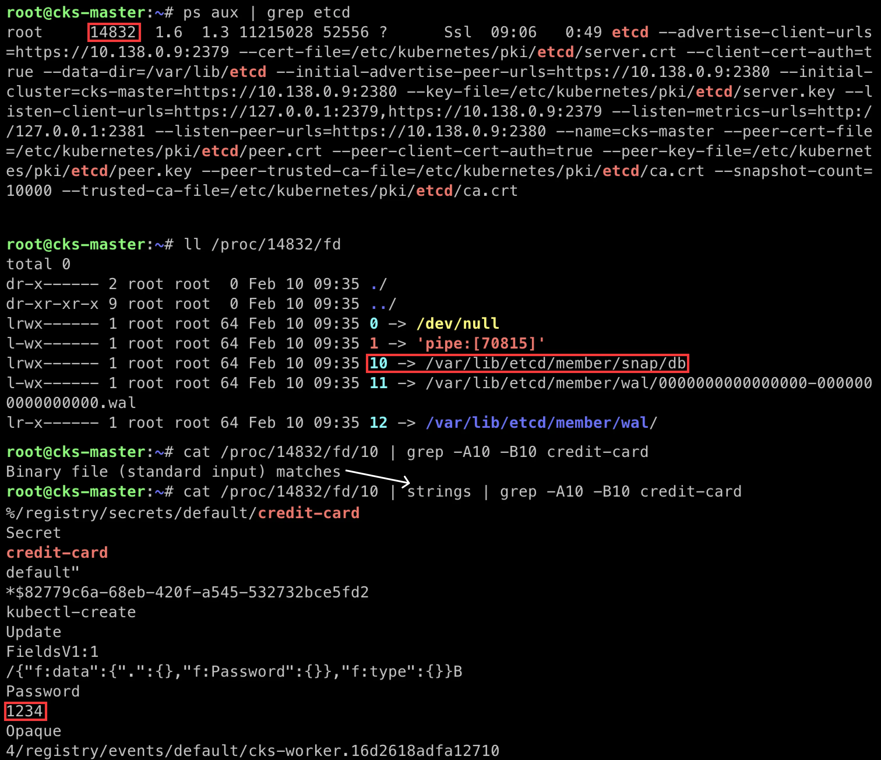 ps aux | grep etcd- etcd의 PID를 가져옵니다.ll /proc/<pid>/fd를 보면 db라고 적힌 link 파일이 보입니다.cat /proc/<pid>/fd/<db> | grep -A10 -B10 credit-card명령을 통해 사전에 만들었던 비밀번호를 찾습니다. 넉넉하게 앞뒤로 10줄씩 추가로 출력합니다.- (옵션) Binary file matches 오류가 뜨면 중간에