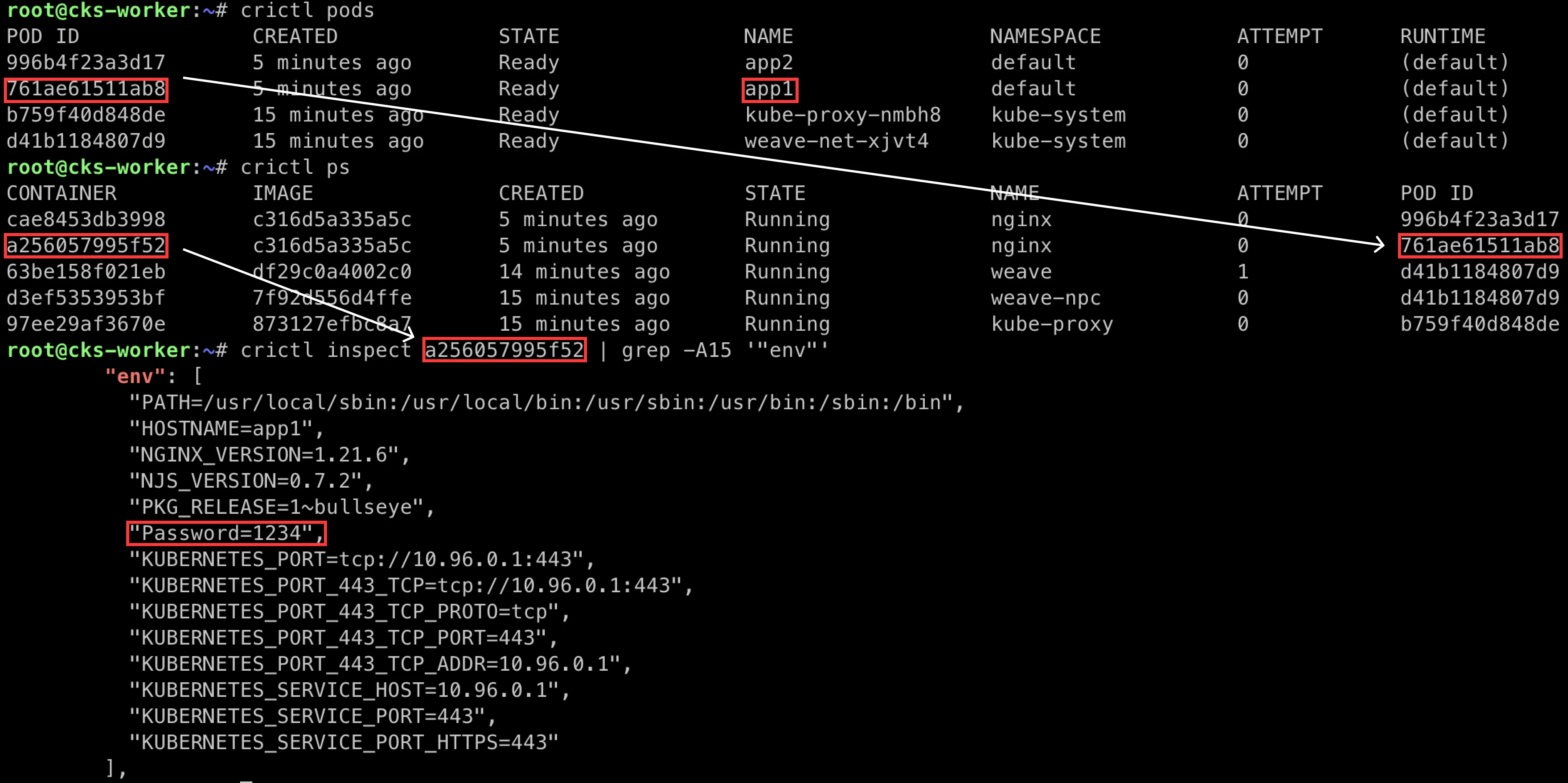 crictl pods- app1의 Pod ID를 찾습니다.crictl ps- Pod ID에 상응하는 컨테이너를 찾습니다.crictl inspect <container id> | grep -A16 env- 해당 컨테이너를 상세 조회해 환경 변수를 추출합니다.