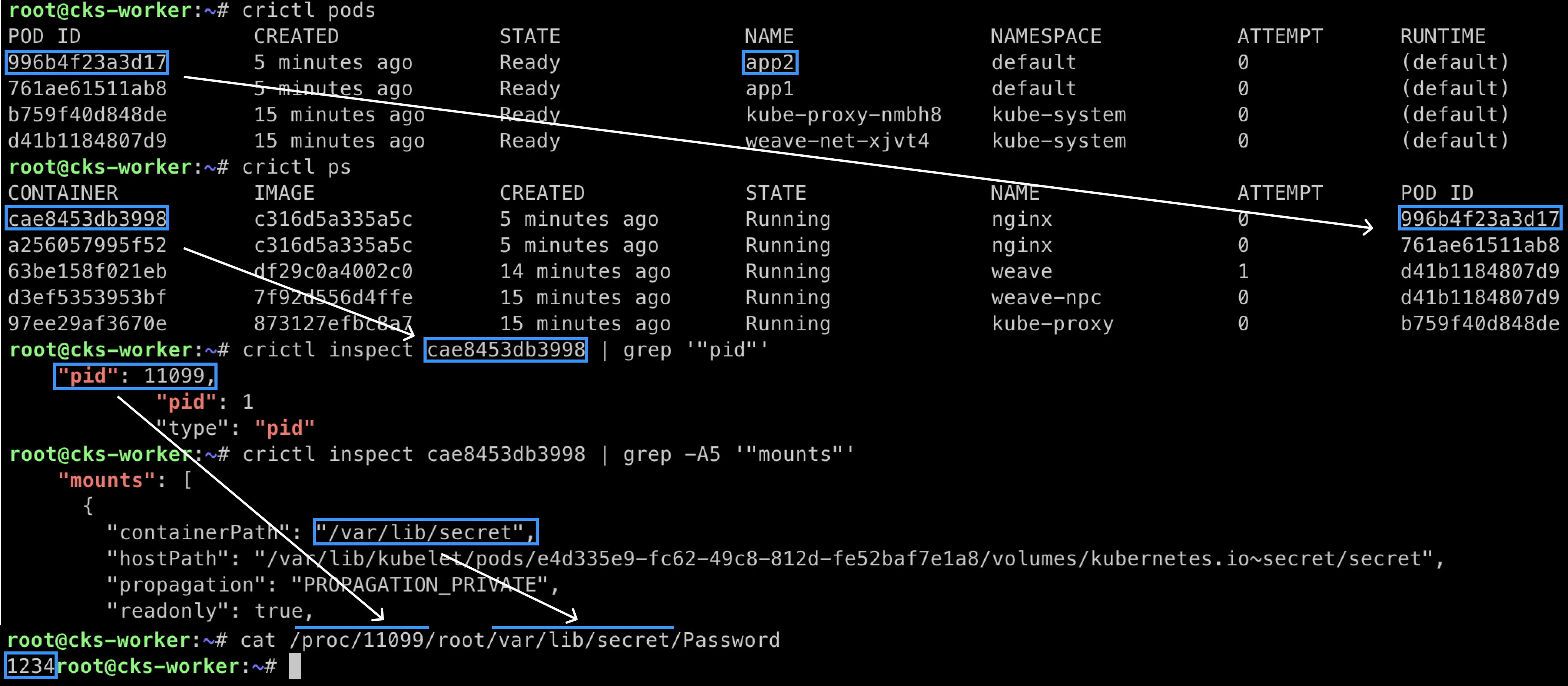 crictl inspect <container id> | grep pid- 컨테이너를 상세 조회해서 컨테이너의 프로세스 ID(PID)를 찾습니다.crictl inspect <container id> | grep -A10 mounts- 또한 secret이 어느 위치에 mount 되었는지도 찾습니다./proc/[pid]디렉터리에서 secret이 마운트된 위치에 접근해 비밀번호를 추출합니다.