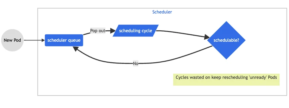 하지만 스케줄링을 통해 노드가 결정되면 끝나지만 외부 이벤트를 통해 노드를 찾지 못해 스케줄링 프로세스가 계속 반복될 수 있습니다. 아래의 그림과 같이 파드가 생성되면 스케줄러는 지속적으로 적합한 노드를 찾습니다. 이런 과정은 노드를 찾거나 파드가 삭제될 때까지 계속 진행됩니다. 외부 이벤트로 차단된 파드와 같이 몇몇 파드는 오랜 기간 준비상태를 유지하며 스케줄링 사이클에 버려집니다. 이런 파드들로 인해 스케줄링 주기는 20ms 이상 걸릴 수 있고 스케줄링 성능에 큰 영향을 미치게 됩니다.
