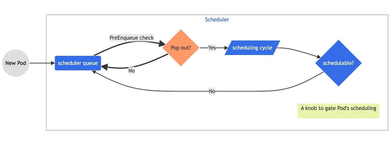 스케줄링 게이트는 새로 생성된 파드가 작동할 준비가 되지 않았음을 알리고 스케줄러는 이 파드를 무시하므로 불필요한 스케줄링 시도를 줄입니다. Cluster Autoscaler에서도 동일합니다. 이런 과정은 API 서버의 호출 없이 일어나, 부하를 유발하지 않습니다. 게이트를 지우는 것은 외부 컨트롤러가 합니다. 여러 스케줄링 게이트가 있다면 모두 삭제되어야 파드는 스케줄링 됩니다. 그렇다면, 스케줄링 게이트는 어떻게 사용할까요?