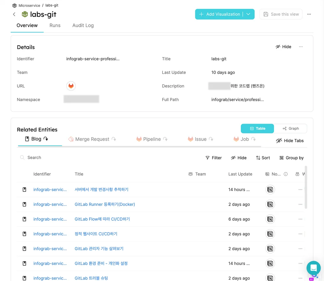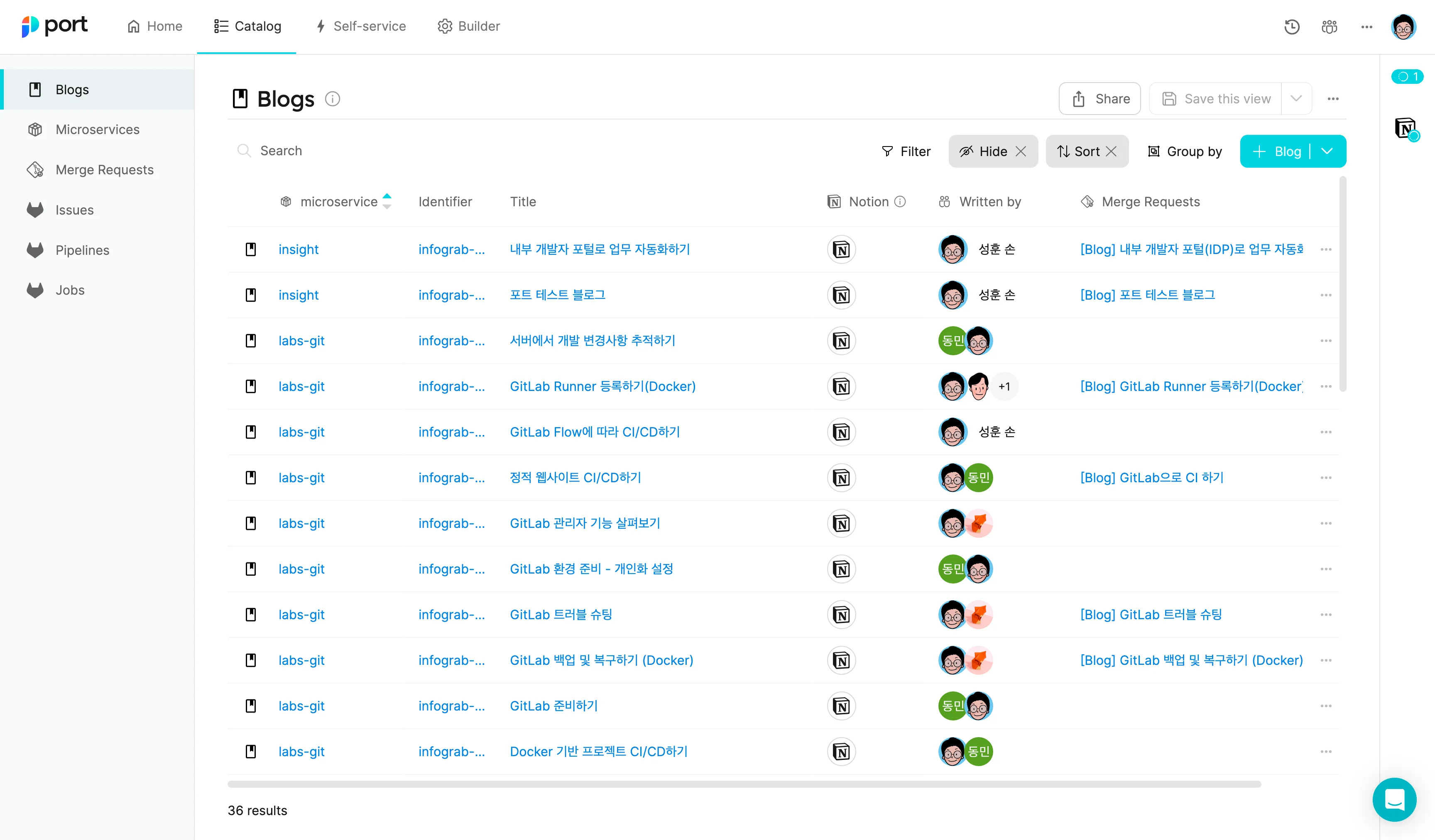 아래는 인포그랩에서 실제 사용하는 내부 개발자 포털입니다. 블로그 각각에 얽힌 작성자와 이슈, Merge Request 등을 한눈에 파악할 수 있습니다. 아울러 여러 곳에 흩어져 있던 교육 블로그, 사내 블로그 등을 통합하여 쉽게 관리할 수 있습니다. 이렇게 하면 개발자는 물론이고 Git에 익숙하지 않더라도 모든 사람이 손쉽게 작업을 진행할 수 있게 됩니다.