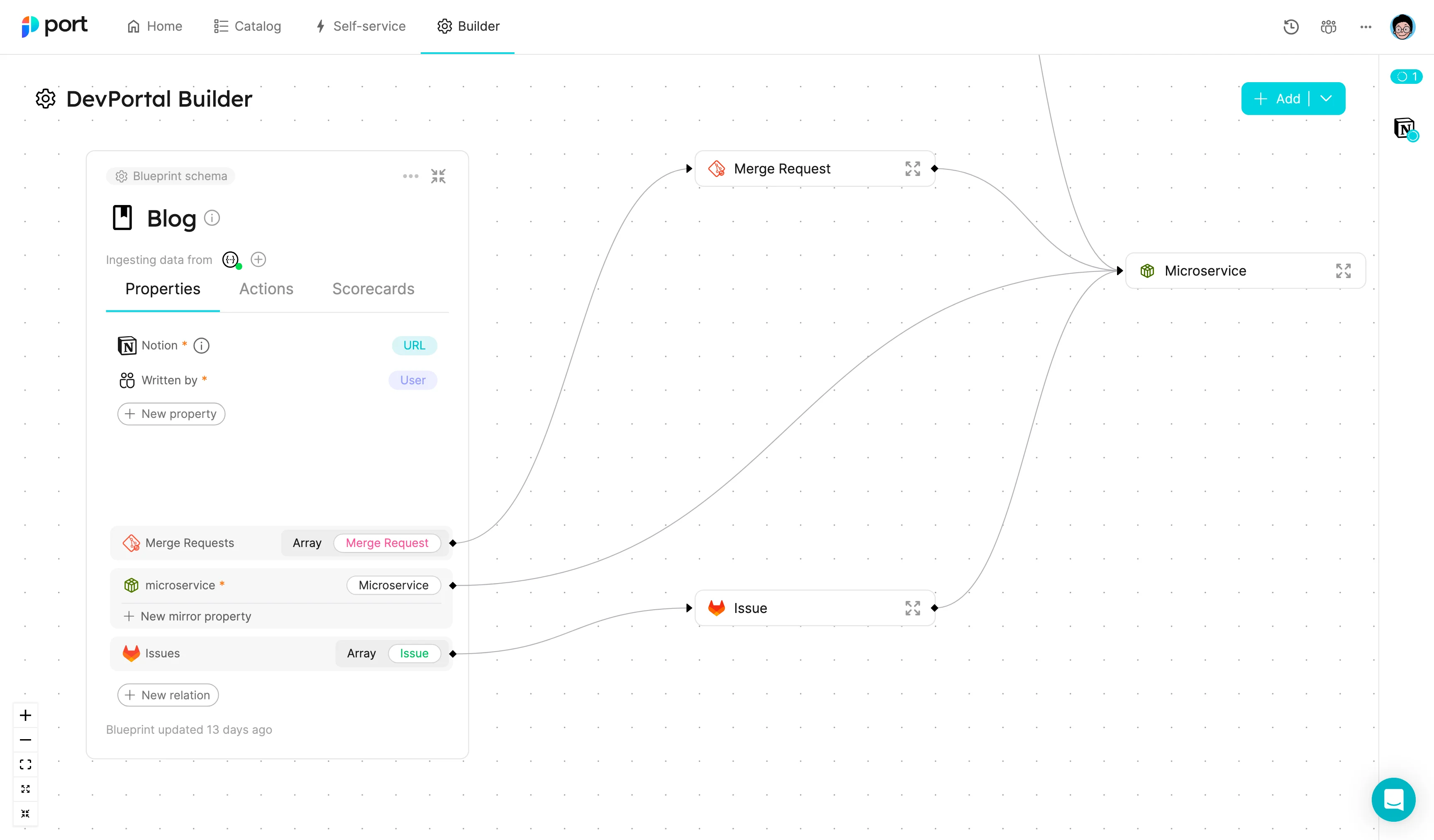 또한 대부분은 이슈와 Merge Request를 만든 후 그 아래에서 작업하는데요. 이를 반영해 내부 개발자 포털에서 Blog 블루프린트를 이슈와 Merge Request 블루프린트에 연결(relation)하였습니다. 최종 결과는 아래 그림과 같습니다.