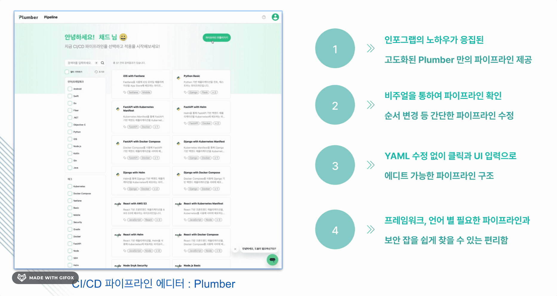 참고로 Plumber는 CI/CD 파이프라인 밀키트로, 인포그랩이 개발했습니다. 이는 약 30개의 프로덕션 환경에서 쓸 수 있는 CI/CD 파이프라인을 약 70개의 잡(job)으로 구성한 템플릿인데요. Plumber를 활용하면 CI/CD 파이프라인을 더 손쉽게 구축할 수 있습니다.