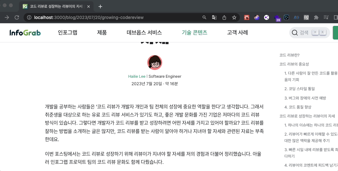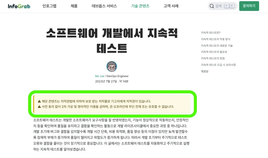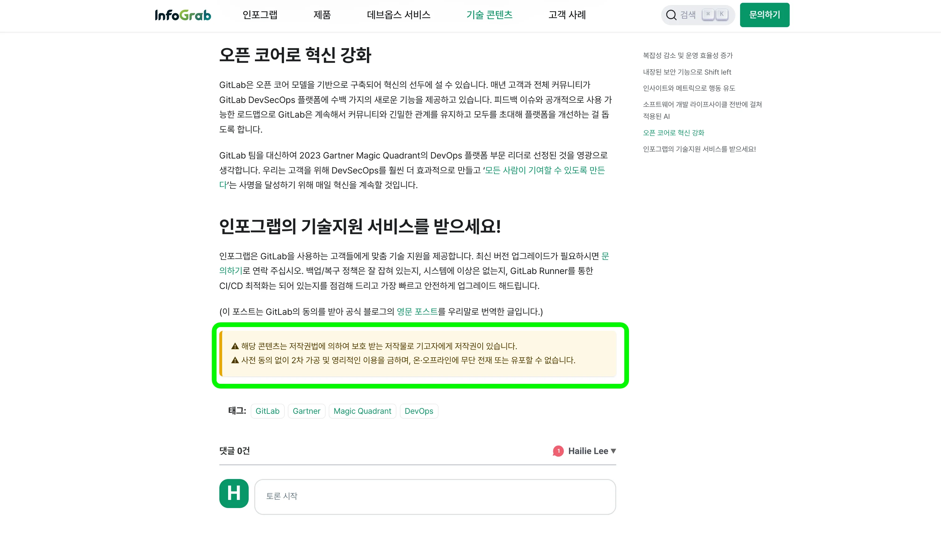 인사이트 기술 블로그에 추가한 저작권 보호 콜아웃 예시. 출처=인포그랩