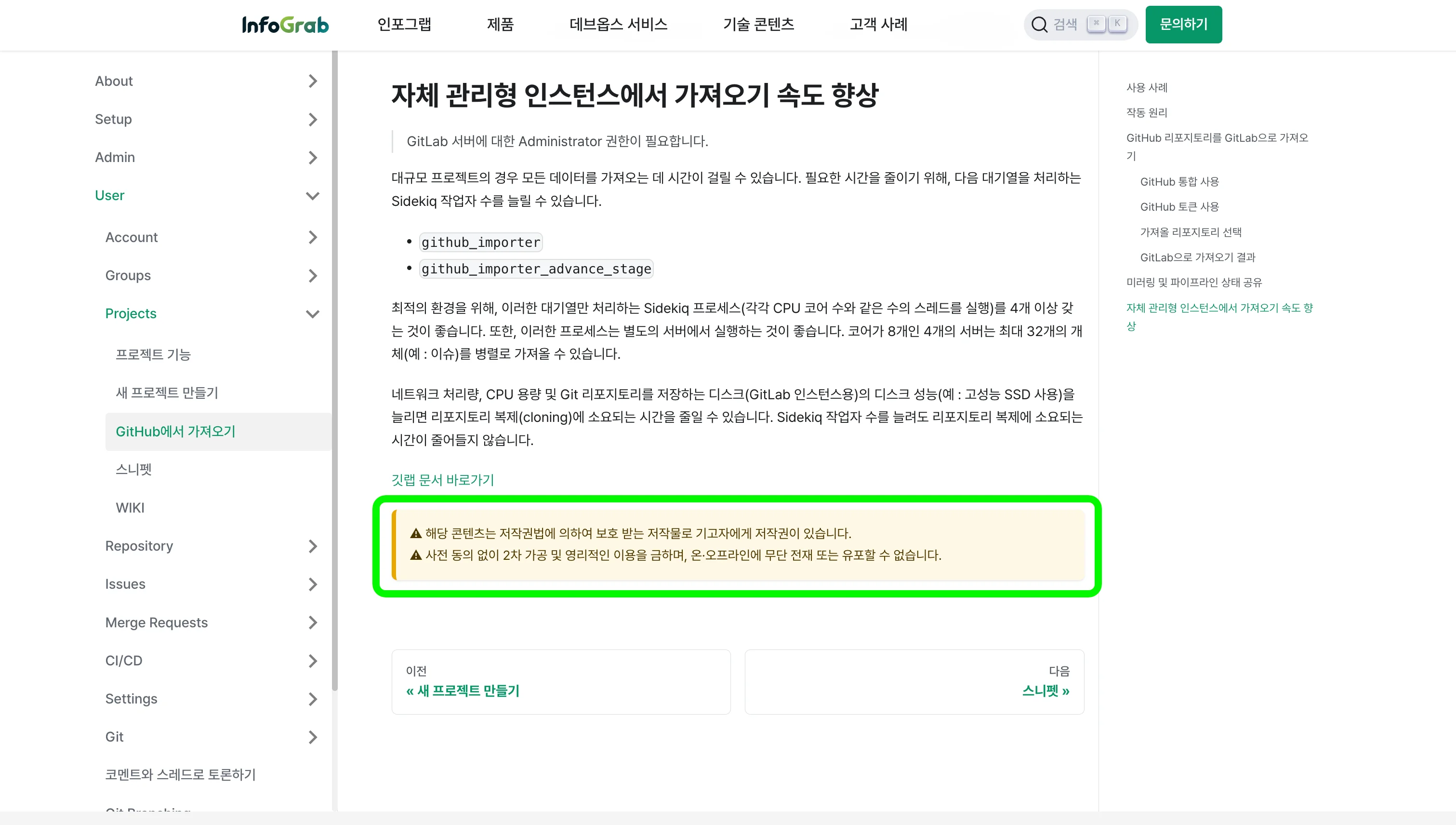 인사이트 GitLab 가이드 문서에 추가한 저작권 보호 콜아웃 예시. 출처=인포그랩