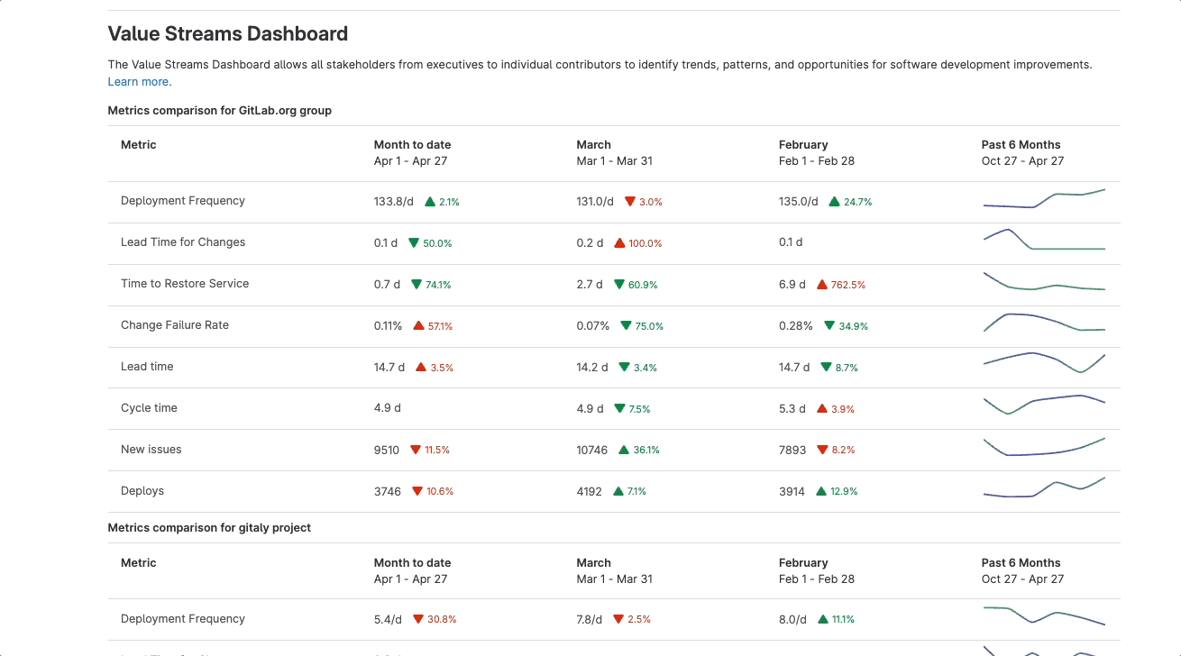 이러한 대시보드의 직관적인 인터페이스는 학습 곡선을 줄이고 광범위한 교육이 필요하지 않습니다. 관리자는 비교 패널로 팀 개선 사항을 추적하고 시간에 따른 패턴이나 트렌드를 쉽게 찾을 수 있습니다. 데이터는 간단명료하게 표시돼 메트릭의 중요성을 빠르게 이해할 수 있습니다. 또한 사용자는 각 메트릭에서 세부 보고서를 드릴 다운해 기본 데이터를 조사하고, 팀 성과에 영향을 미치는 요인을 파악하며, 실행 가능한 인사이트를 확인할 수 있습니다. 이제 누구나 GitLab의 통합 데이터 저장 기능을 활용하여 시간과 리소스를 절약하고, 생산성을 극대화할 수 있습니다.