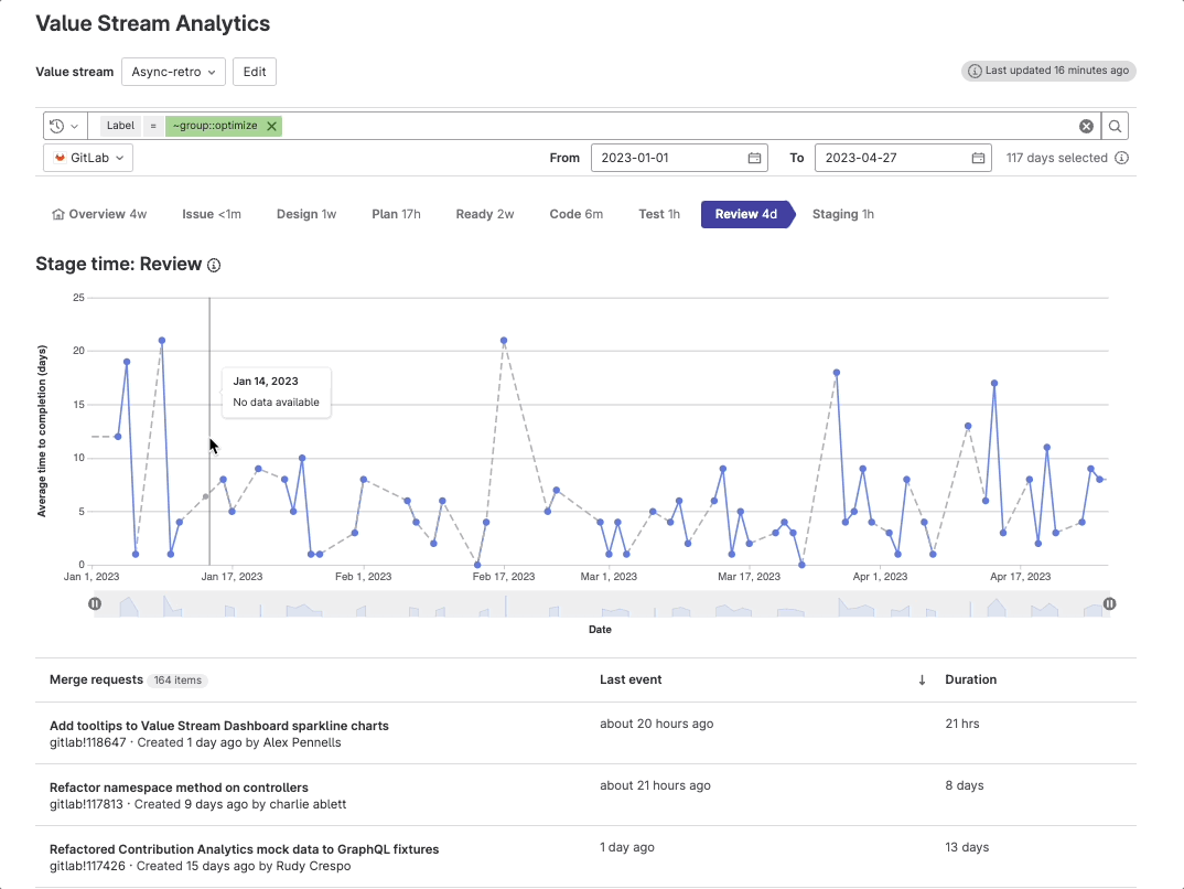 주요 관심 영역을 확인하면 Value Stream Analytics를 사용해 프로젝트의 특정 스테이지로 더 자세히 드릴 다운 할 수 있습니다. 스테이지 테이블에서 Last event 열을 정렬하면 가장 최근 워크플로 이벤트를 확인하고, 기간별로 항목을 분류해 이벤트를 재배열하며 더 빠르게 인사이트를 얻을 수 있습니다. 이렇게 하면 해당 스테이지에서 프로젝트를 느리게 하는 작업을 쉽게 감지할 수 있습니다. 또 지연 원인인 작업의 Owner를 확인하고, 코드 변경 사항을 검토하며, Issue를 종합적으로 분석할 수 있습니다.