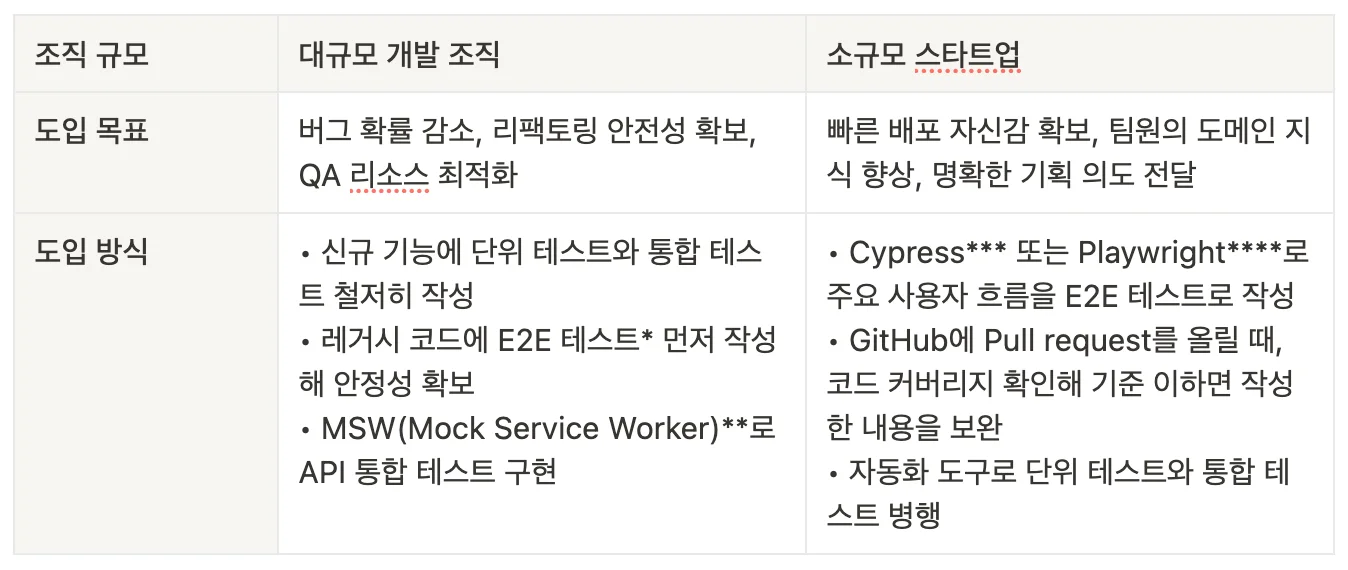 제가 조사한 조직 규모별 테스트 코드 도입 사례는 아래와 같습니다.