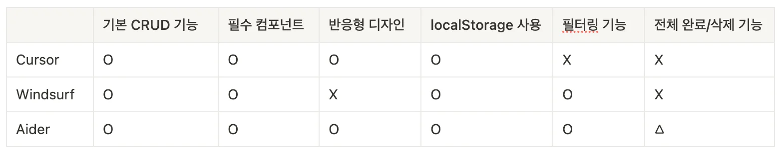 AI 코딩 도구 개발 결과 비교\:\ Cursor, Windsurf, Aider
