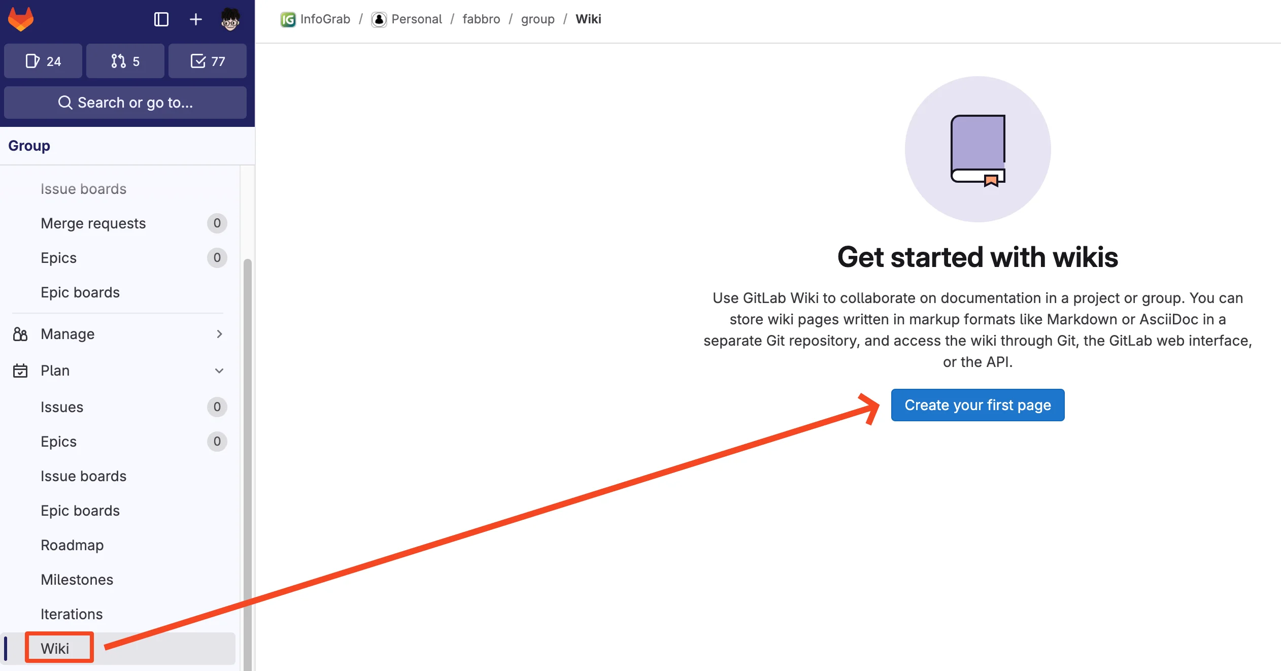 GitLab Project 혹은 Group > Plan > Wiki 메뉴에 진입합니다.