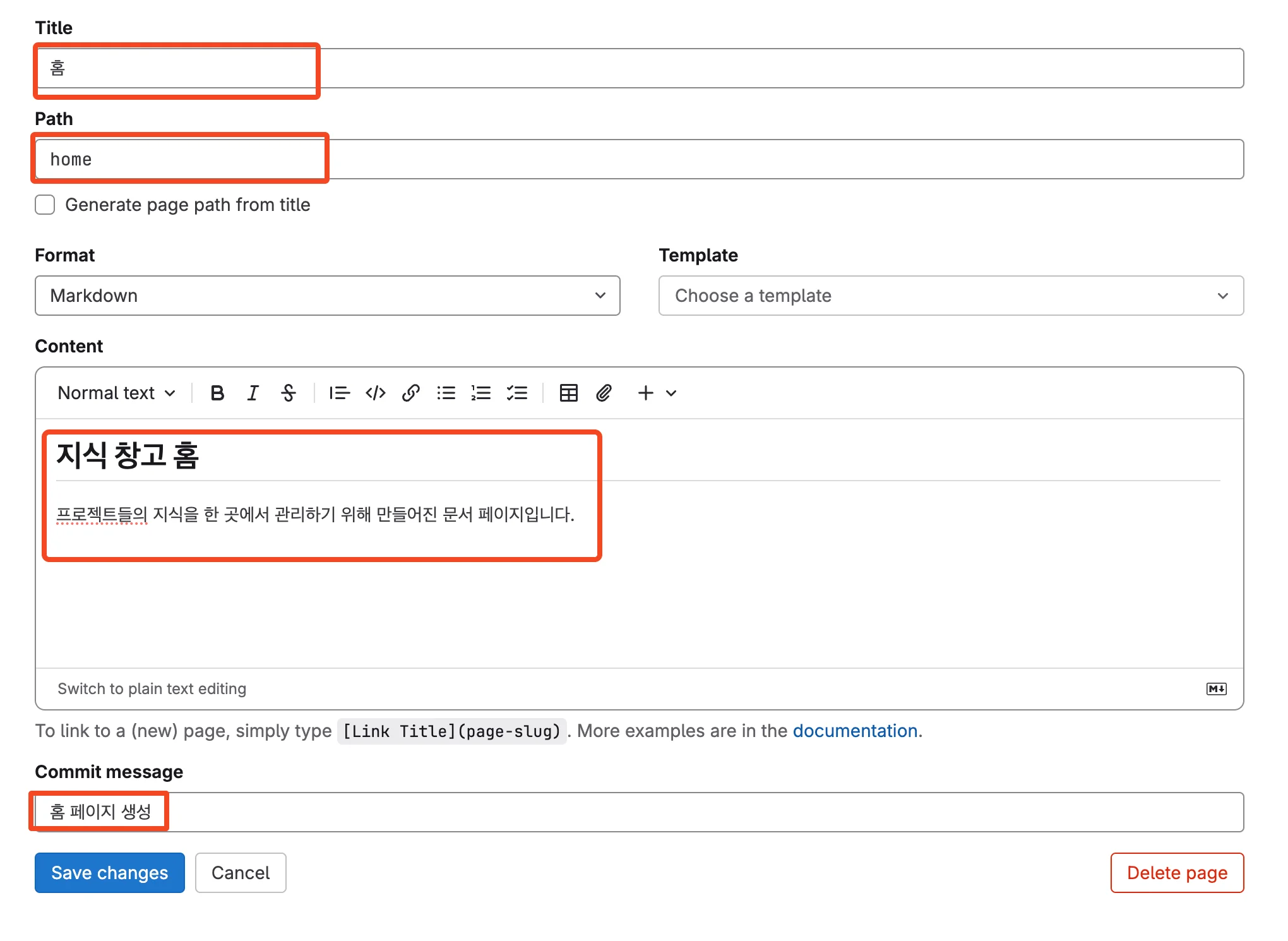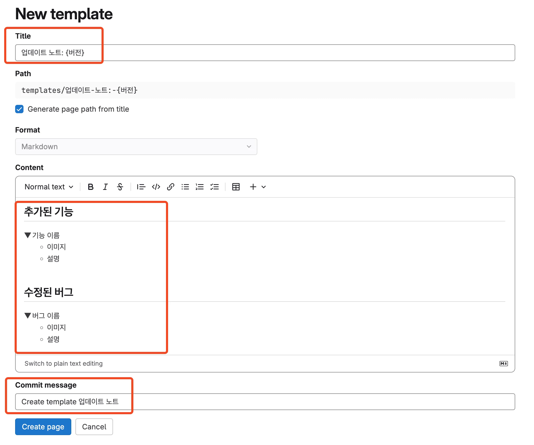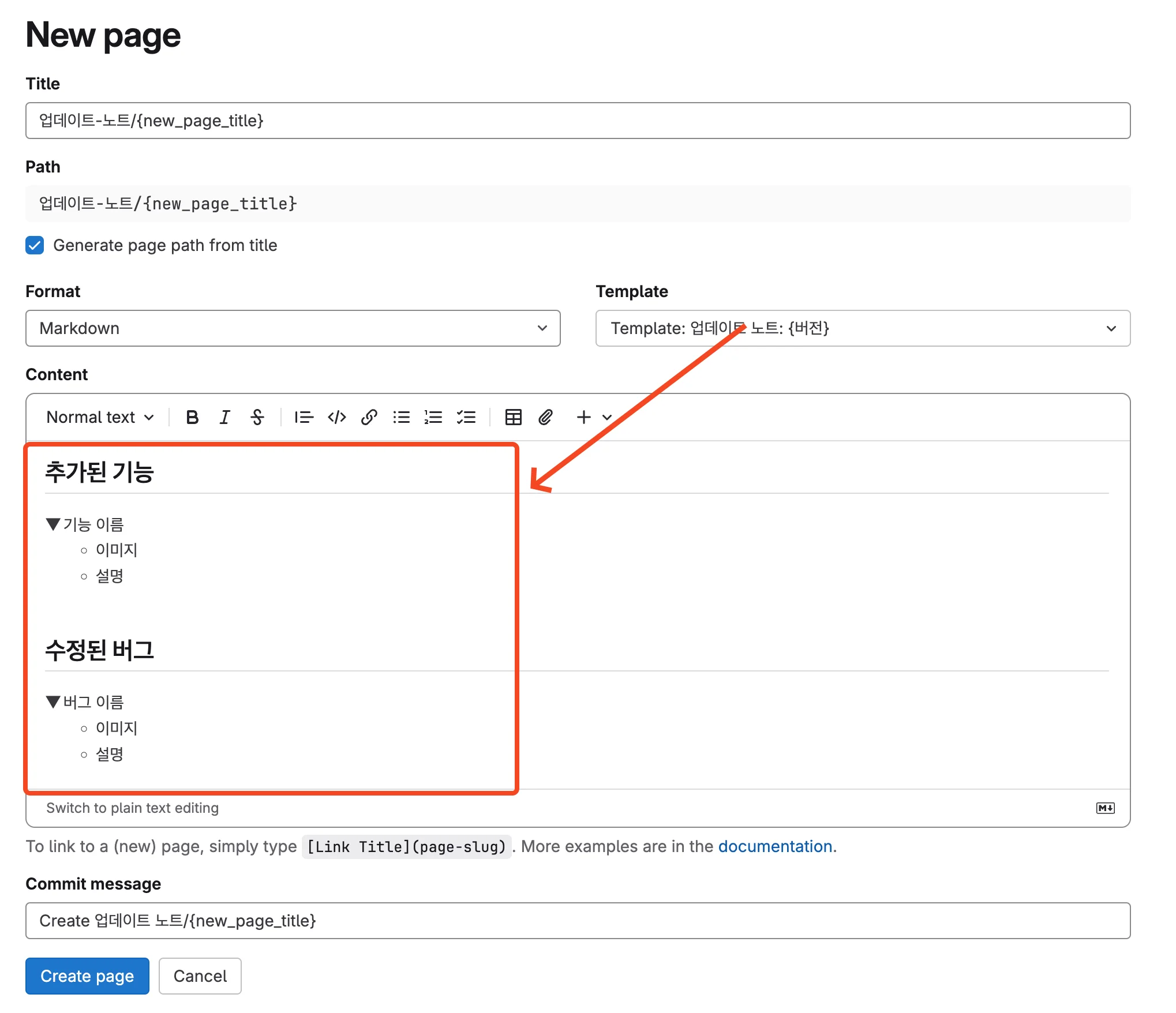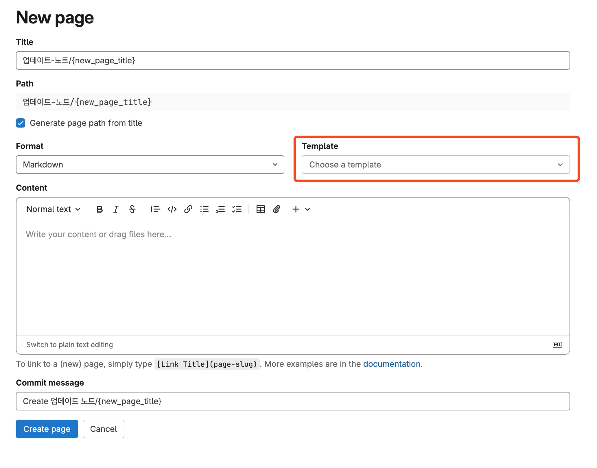 템플릿 Title, Content, 커밋 메시지를 작성합니다. Create page 버튼을 누르면 템플릿이 생성됩니다.