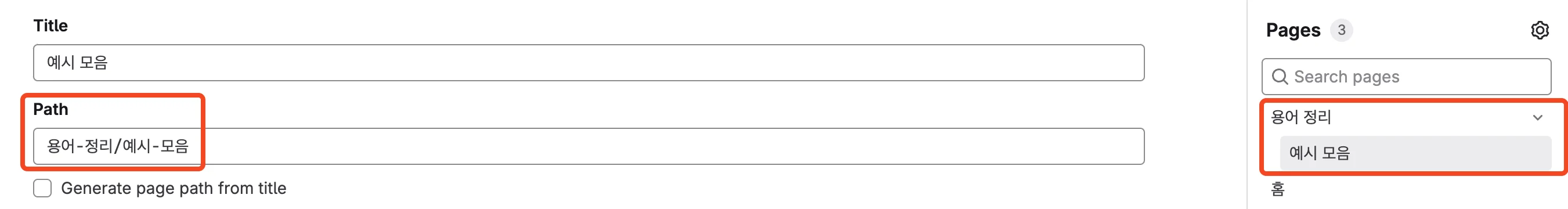 /로 문서 위치를 구분합니다. 이는 기본적으로 문서 제목에 기반해 자동 입력됩니다. 아래 Generate page path from title 체크박스를 해제하면, 경로를 수동으로 바꿀 수 있습니다. 그러나 임의로 변경한 모든 경로를 다 기억하기 어려우므로 문서 제목에 기반한 경로를 유지하는 걸 추천합니다. 이 예시에서는 Wiki 페이지의 첫 번째 경로가 ‘home’으로 고정됐기에 첫 번째 페이지의 경로는 반드시 ‘home’으로 입력합니다. - Content: 문서 내용을 입력합니다.