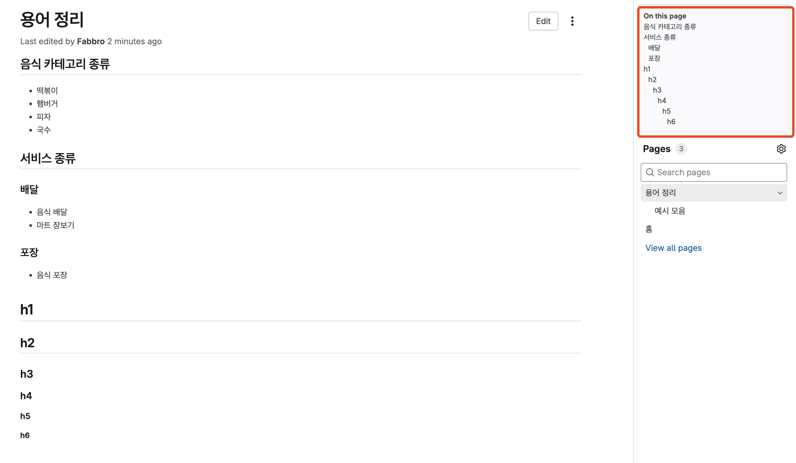 사이드바에서는 페이지별 목차도 보여줍니다. heading1~6까지 나옵니다.