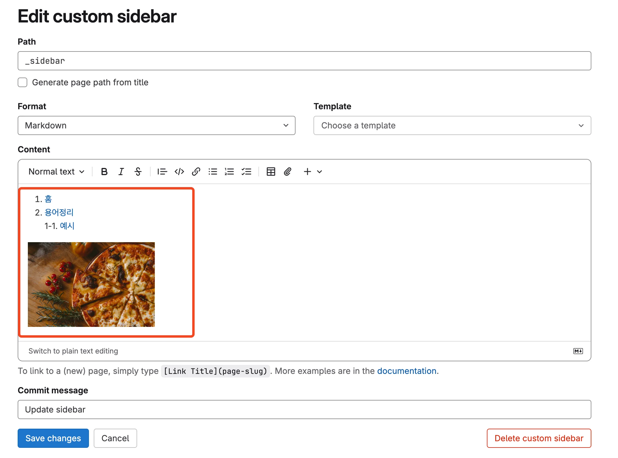 Edit custom sidebar의 Content 칸에 링크 텍스트로 페이지 버튼을 직접 만듭니다. 이미지를 넣어 자유롭게 꾸며도 됩니다.
