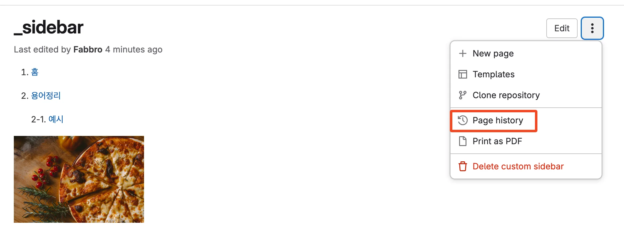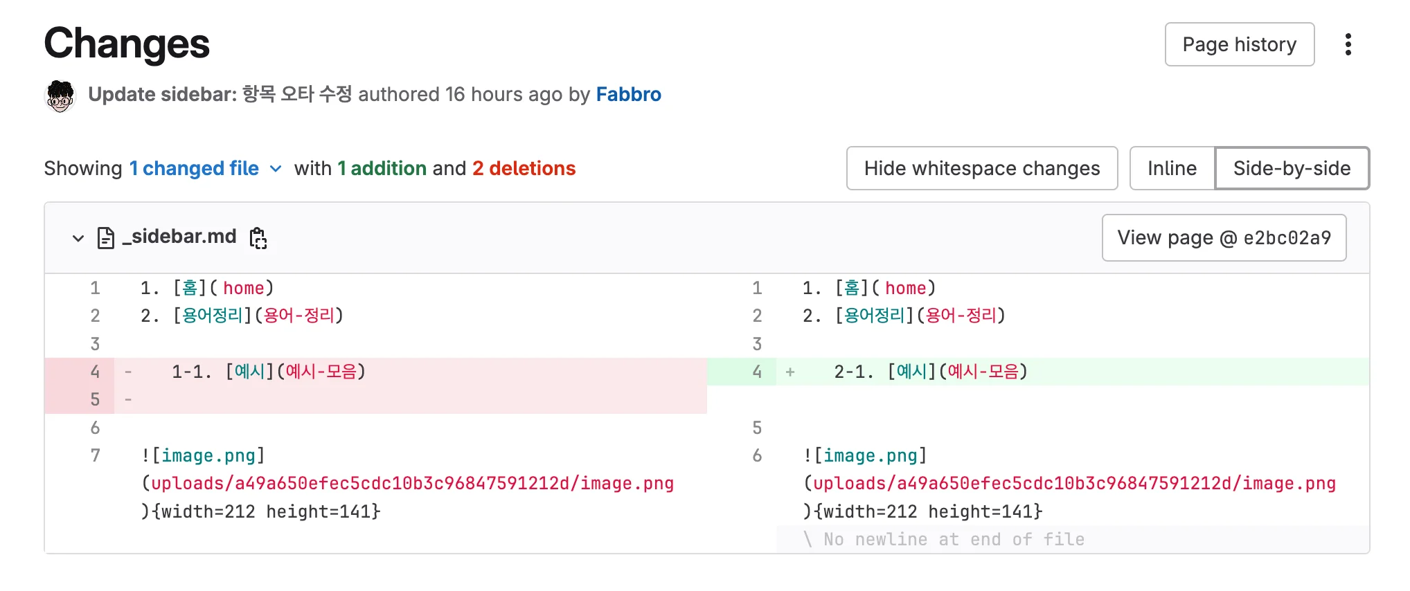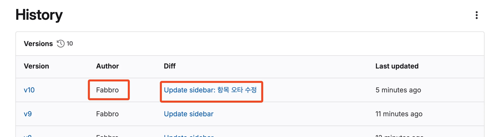 Wiki에서는 ‘History’ 기능으로 ‘누가, 언제, 어떻게 페이지를 변경했는지’ 파악할 수 있습니다. 여기서는 사이드바 오타 수정 이력을 History 기능으로 확인하겠습니다.