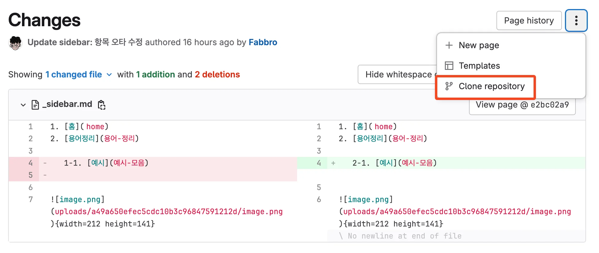Wiki 페이지 오른쪽 상단의 케밥 메뉴를 눌러 Clone repository를 클릭, git clone 합니다.