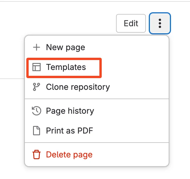 Wiki 페이지 오른쪽 상단의 케밥 메뉴를 눌러 템플릿 페이지에 진입합니다.