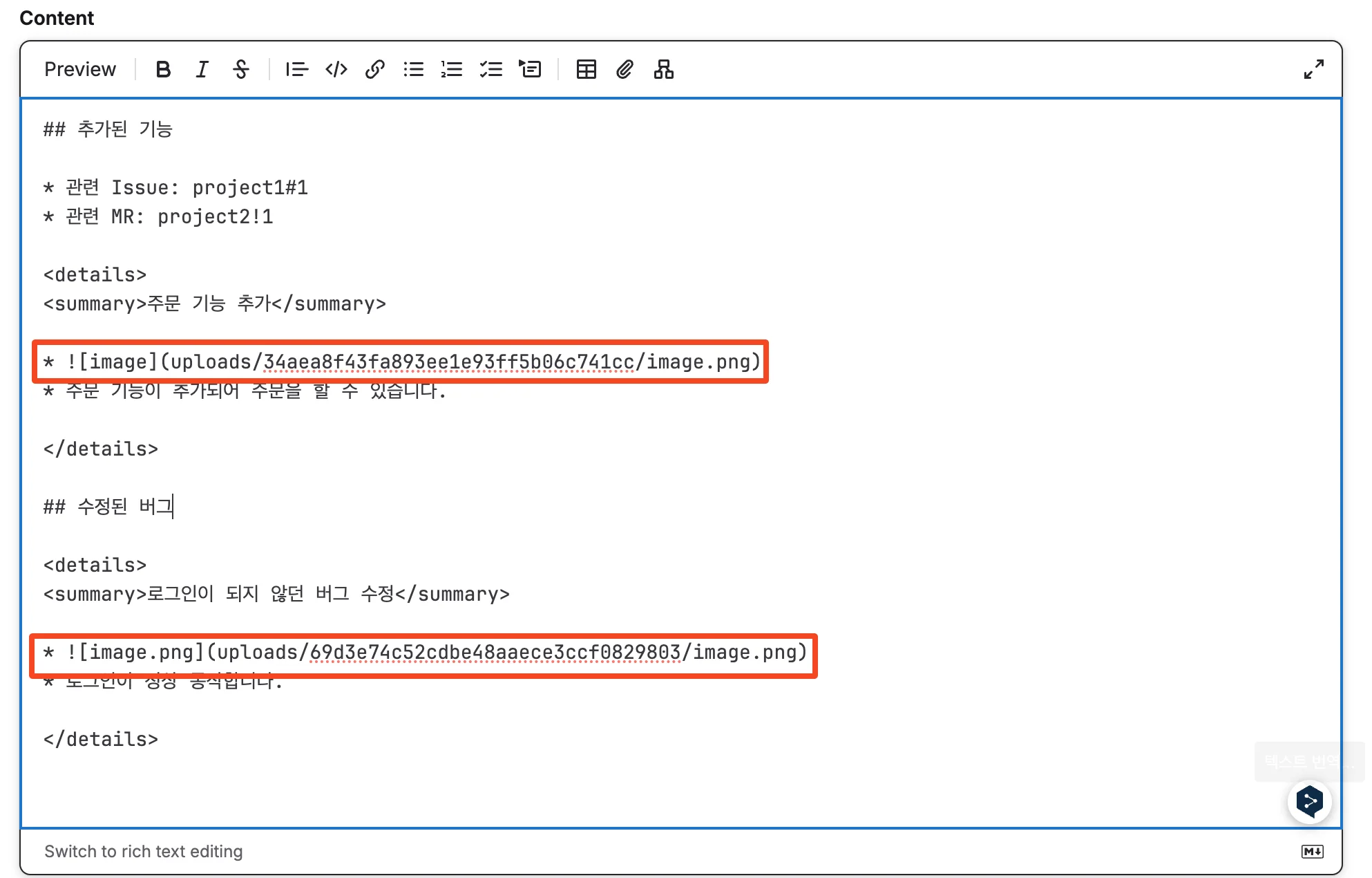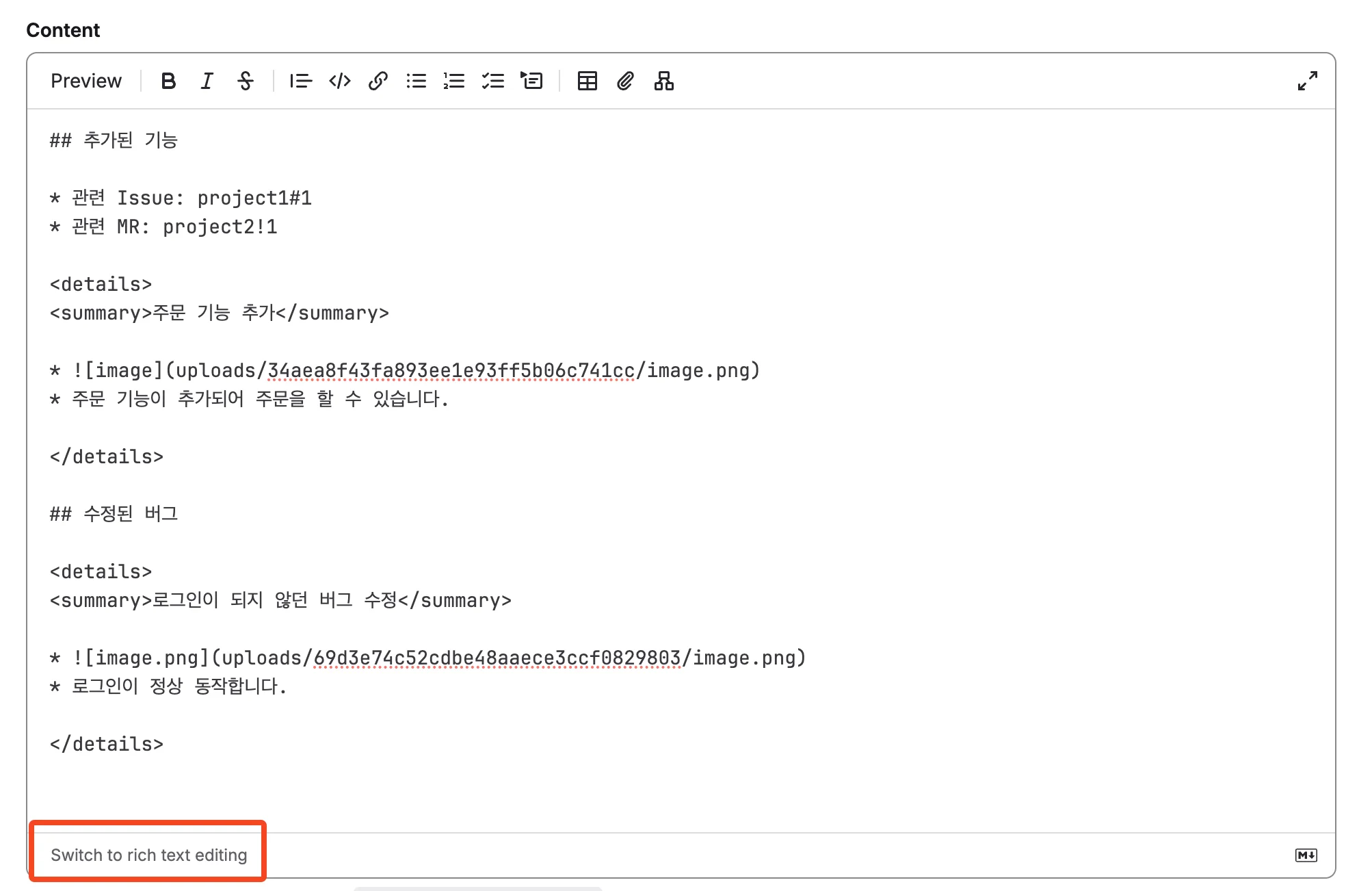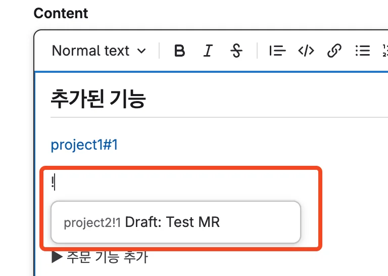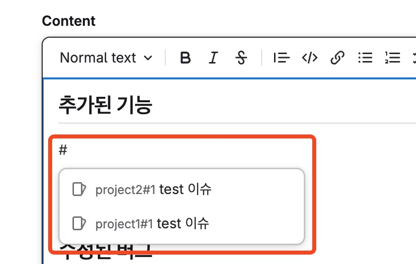 에디터 Content 칸에 #을 입력하면 이슈가, !를 입력하면 MR이 나타납니다.