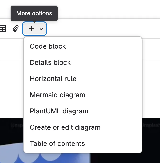+ 버튼을 클릭해 다양한 도구를 활용하세요. Details block을 누르면 details html 코드를 직접 삽입하지 않아도 됩니다. Create or edit diagram을 누르면 GitLab에서 바로 다이어그램을 작업할 수 있습니다. 또 Table of contents를 누르면 목차가 추가됩니다. 이밖에 여러 도구를 한번씩 클릭하며 기능을 확인하세요.