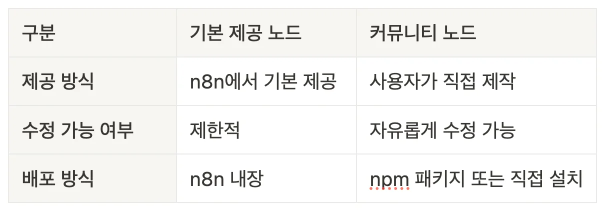 기본 제공 노드는 n8n 공식 팀이 업데이트하고 유지 관리합니다. 그러나 커뮤니티 노드는 사용자 스스로 원하는 기능을 개발하고 확장할 수 있습니다.