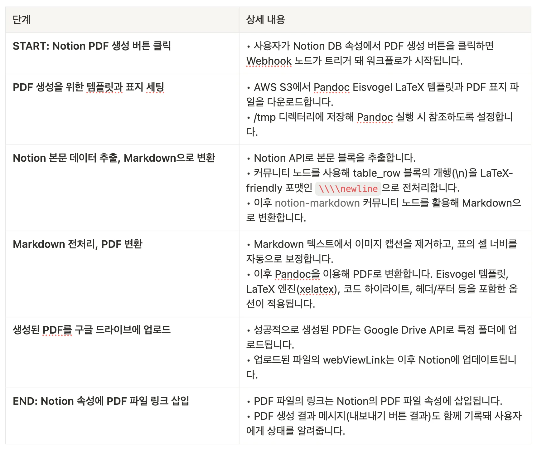 그러나 이번 프로젝트는 ‘Notion 문서 PDF 변환 자동화’라는 특수한 도메인을 다뤄 저는 일반 워크플로를 설계할 때와 조금 다른 도전 과제를 만났습니다.