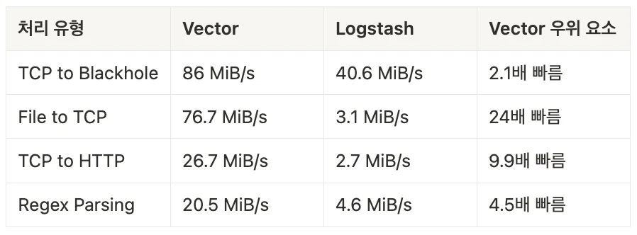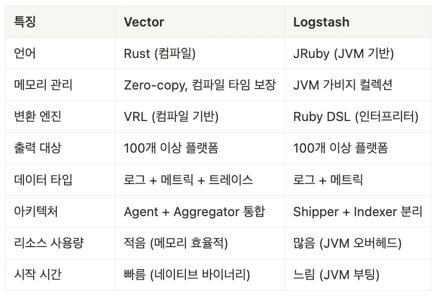 Vector의 특징은 Logstash와 비교할 때 명확히 확인할 수 있습니다.
