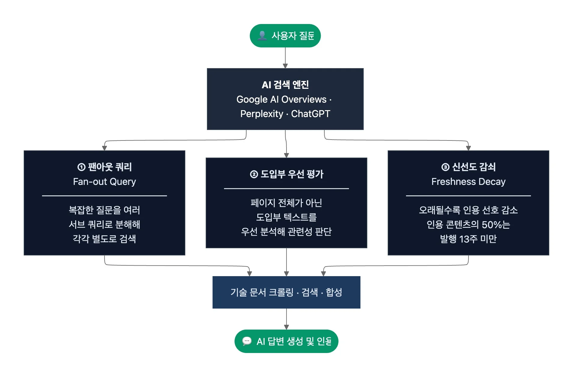 AI 검색 엔진이 문서를 소비하는 방식에는 세 가지 핵심 특징이 있습니다. 첫째, AI는 사용자의 복잡한 질문을 여러 서브 쿼리로 분해해 각각 별도로 검색하는데요. 이를 ‘팬아웃 쿼리(Fan-out Query)’라고 합니다. 둘째, AI 검색 엔진은 페이지의 도입부 텍스트를 우선 평가해 답변과의 관련성을 판단하고요. 페이지 전체를 동일한 비중으로 보지 않습니다. 셋째, AI가 인용하는 콘텐츠는 시간이 지날수록 더 새로운 소스로 대체됩니다. 이를 ‘신선도 감쇠(Freshness Decay)’, 즉 콘텐츠가 오래될수록 AI의 인용 선호가 줄어드는 현상이라고 하죠. SEO·AI 검색 전문 에이전시 Amsive의 분석에 따르면, AI가 인용한 콘텐츠의 50%는 발행 13주 미만의 최신 콘텐츠였습니다.